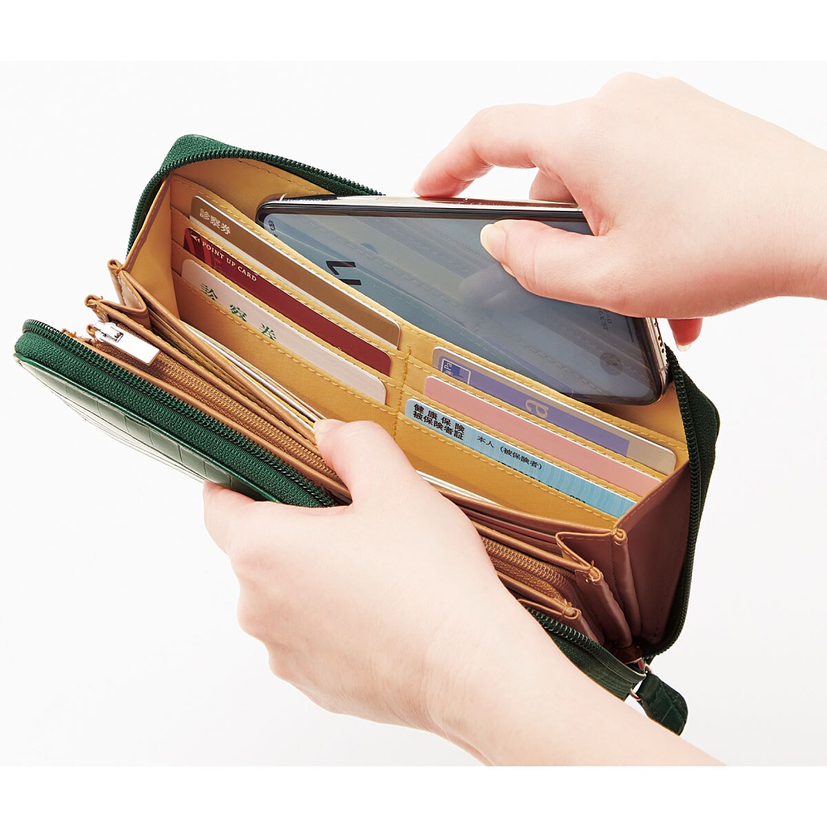 グリーンスマートフォンも入る!(約縦17×横9cmのスマホに対応) ※厚みはケースや財布の中身の量によって異なります