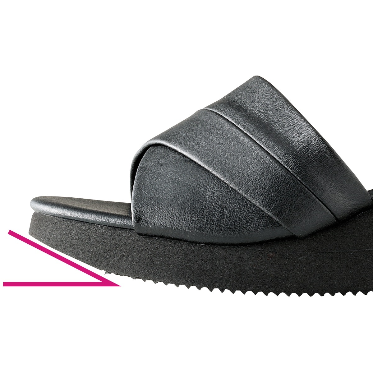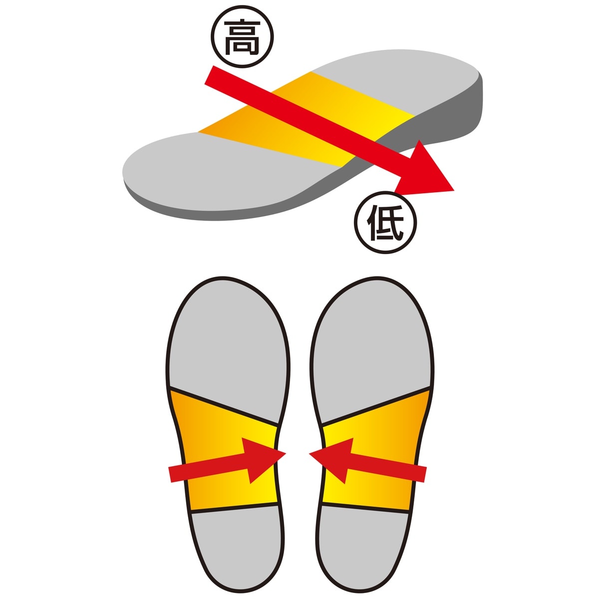 かかと部ではなく、サンダル中央の傾斜部が内側に傾いているためじっくりと内側に荷重をかけていく構造です。膝に負担をかけにくく、無意識に内側荷重に導きます。※イメージ ※効果には個人差があります