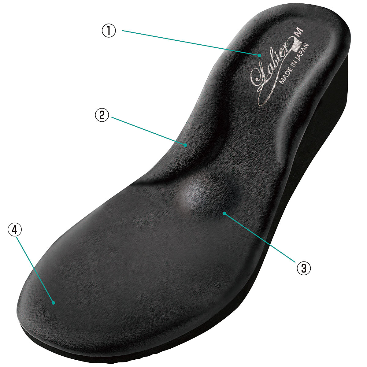 (1)かかとのズレ防止カップインソール(2)足の負担を軽減アーチパッド(3)足裏を刺激する中足骨パッド(4)つま先上がりでつまずきにくい!