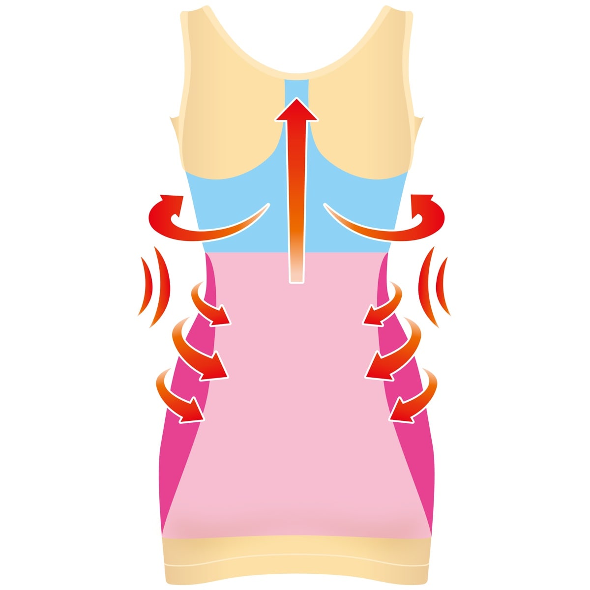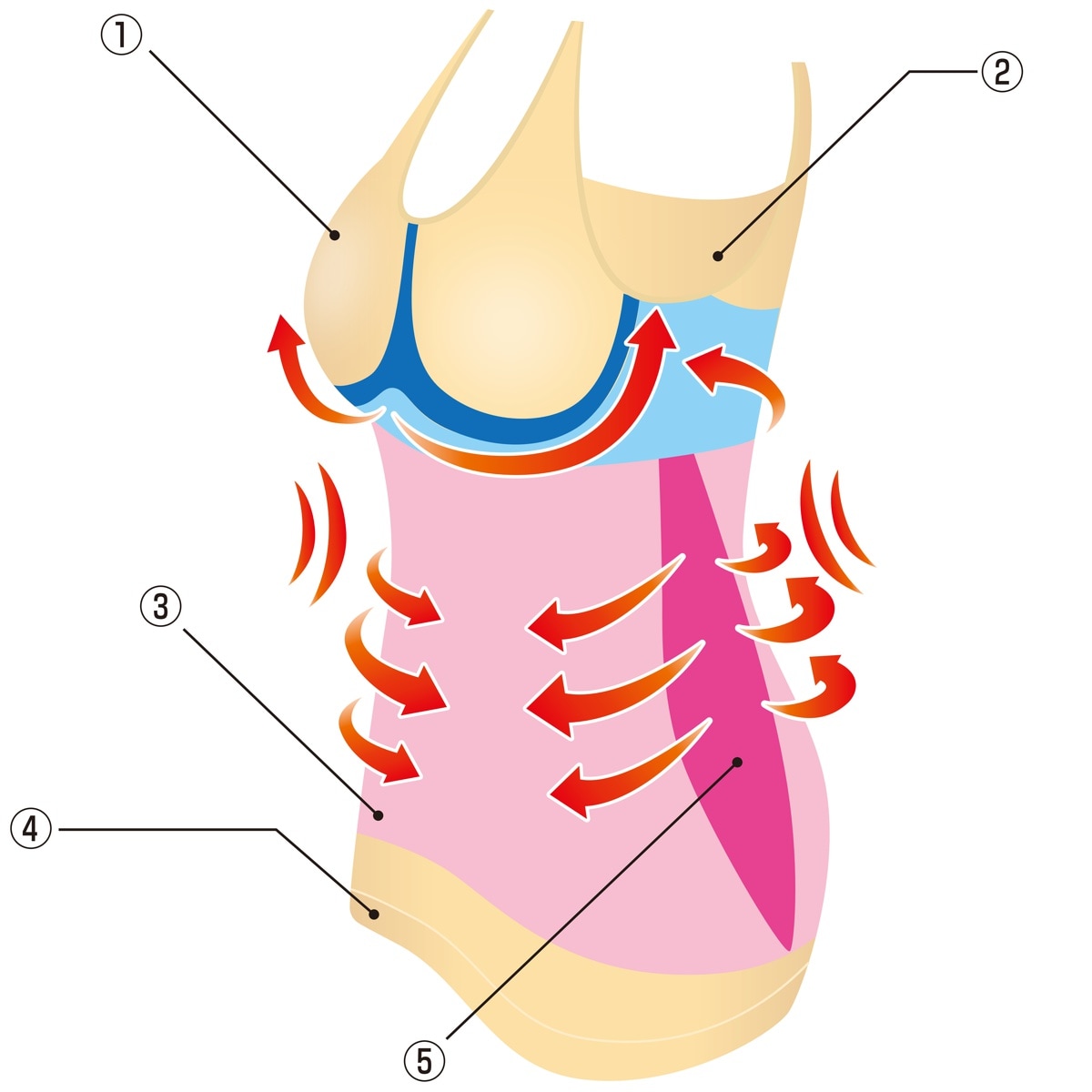 ①コネクティングパッドを採用…ズレを軽減し、下から持ち上げふっくらとしたバストを演出。②汗脇パッド…汗をキャッチしながら脇下の肉を包み込みスッキリ。③360°立体編みで柔らかいのにしっかり引き締め。④長めの丈…お腹がすっぽり隠れる、安心の長め丈。⑤脇腹・ウエスト…ウエストをスッキリ整え、女性らしいカーブに。