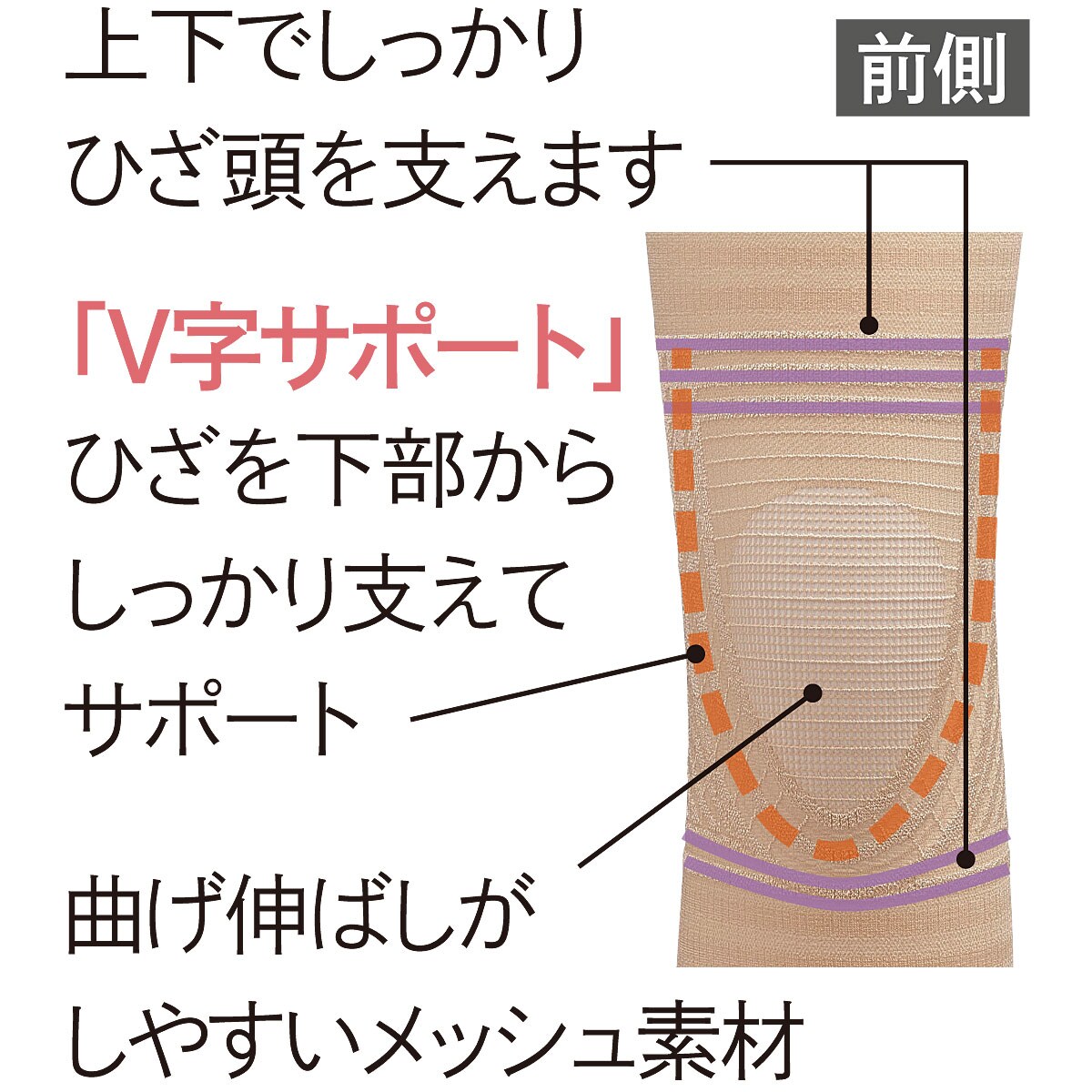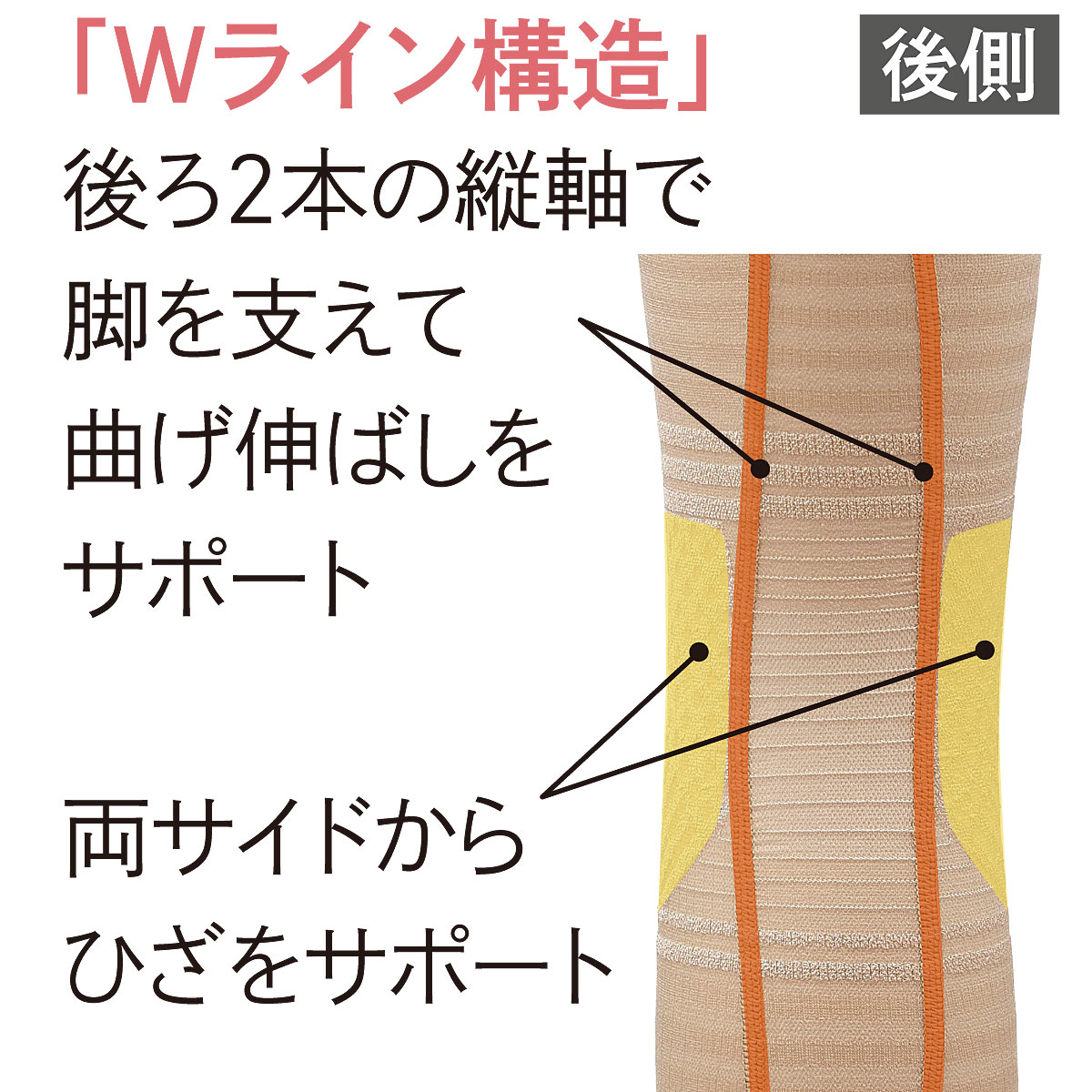 膝を下部からしっかり支えるV字サポートと、2本の縦軸で脚を支えるWライン構造。透ける薄さで目立ちにくいのに、しっかりサポート!