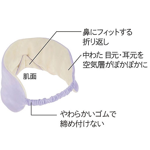 空気層が目元・耳元をぽかぽかにします。鼻にフィットする折り返しとやわらかいゴムで締め付けません。ずっと触っていたいなめらかな生地。就寝中に耳を温め、目元の乾燥対策に。