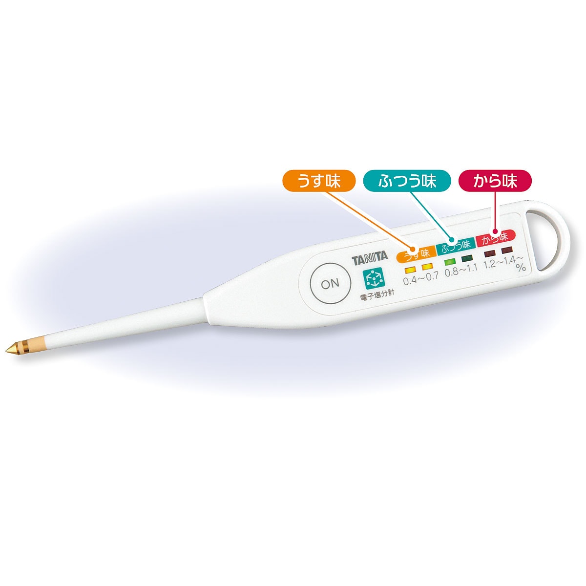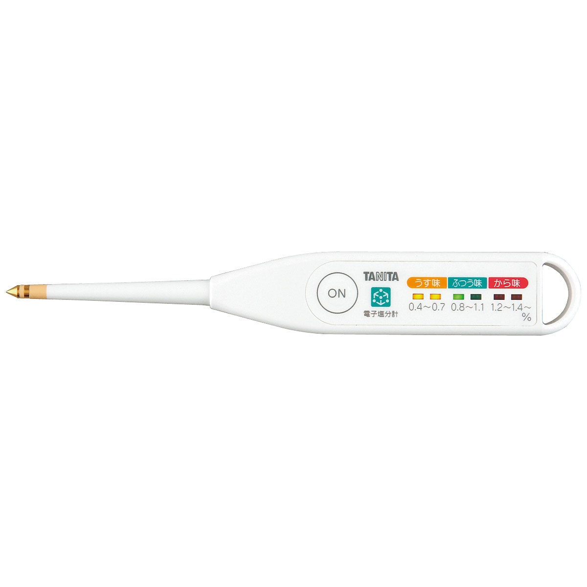 みそ汁やスープなどの液体の塩分濃度をチェック。0.4%~1.4%の範囲でうす味・ふつう味・から味を3色のLED6段階で表示します。【こんな方におすすめ】■塩分摂取量に気をつけたい方に■減塩をサポートしている方に■高血圧を予防したい方に