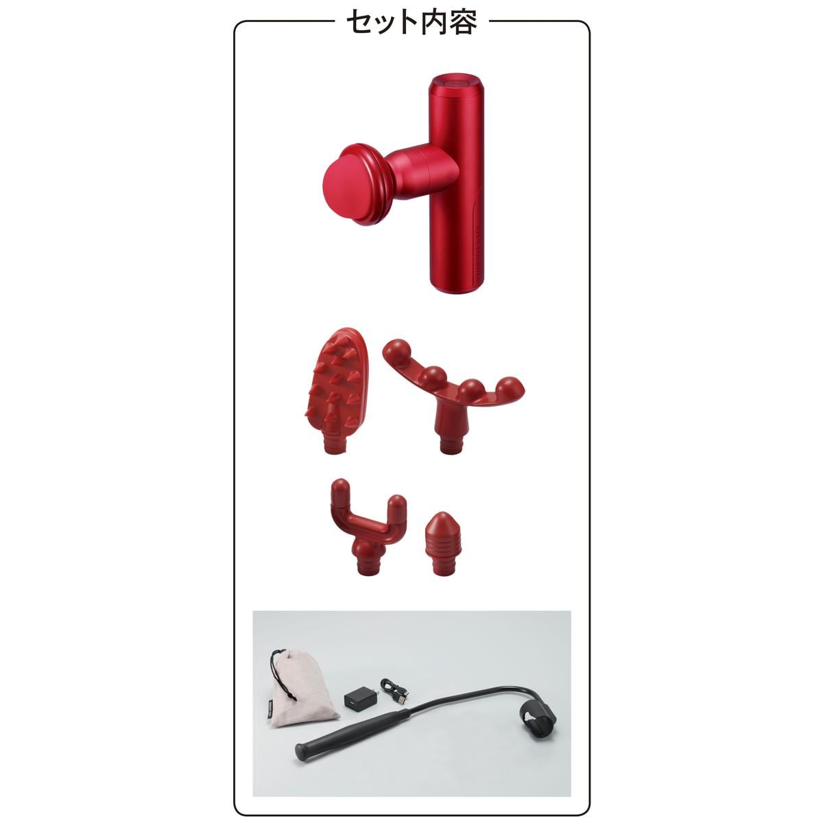 [本体・アーム]アルミニウム合金、ABS樹脂[アタッチメント]ゲル、ABS樹脂、シリコン[収納袋]ポリエステル100%■サイズ(約cm)/[本体]6.7×3.2×12.3■重量(約g)/[本体]220■セット内容/本体、アタッチメント5種類、専用アーム、USBコード、AC・USBアダプター、収納袋■電源/リチウムイオン電池。【航空便不可】■□次のような方はご使用いただけません□■・医師からマッサージを禁じられている方 例:血栓[そく(塞)栓]症、重度の動脈瘤、急性静脈瘤、各種皮膚炎、皮膚感染症・自分で意思表示のできない方や身体の不自由な方■□次のような方は必ず医師にご相談の上ご使用ください□■・ペースメーカーなどの電磁障害の影響を受けやすい体内植込み型医用電気機器を使用している方・悪性しゅよう(腫瘍)のある方・心臓に障害のある方・妊娠初期の不安定期または出産直後の方・糖尿病などによる高度な末しょう(梢)循環障害からくる知覚障害のある方・皮膚に創傷のある方・安静を必要としている方・体温38℃以上(有熱期)の方 例1:急性炎症症状[けん(倦)怠感、悪寒、血圧変動など]の強い時期、 例2:衰弱しているとき・骨粗しょう症の人、せきついの骨折、ねんざ、肉離れなど、急性[とう(疼)痛性]疾患の方・背骨に異常のある人又は、背骨が曲がっている方・けんしょう(腱鞘)炎の方・その他、医療機関で治療中の方●中国製【返品・交換不可】 【保証書付1年間】(本体のみ)