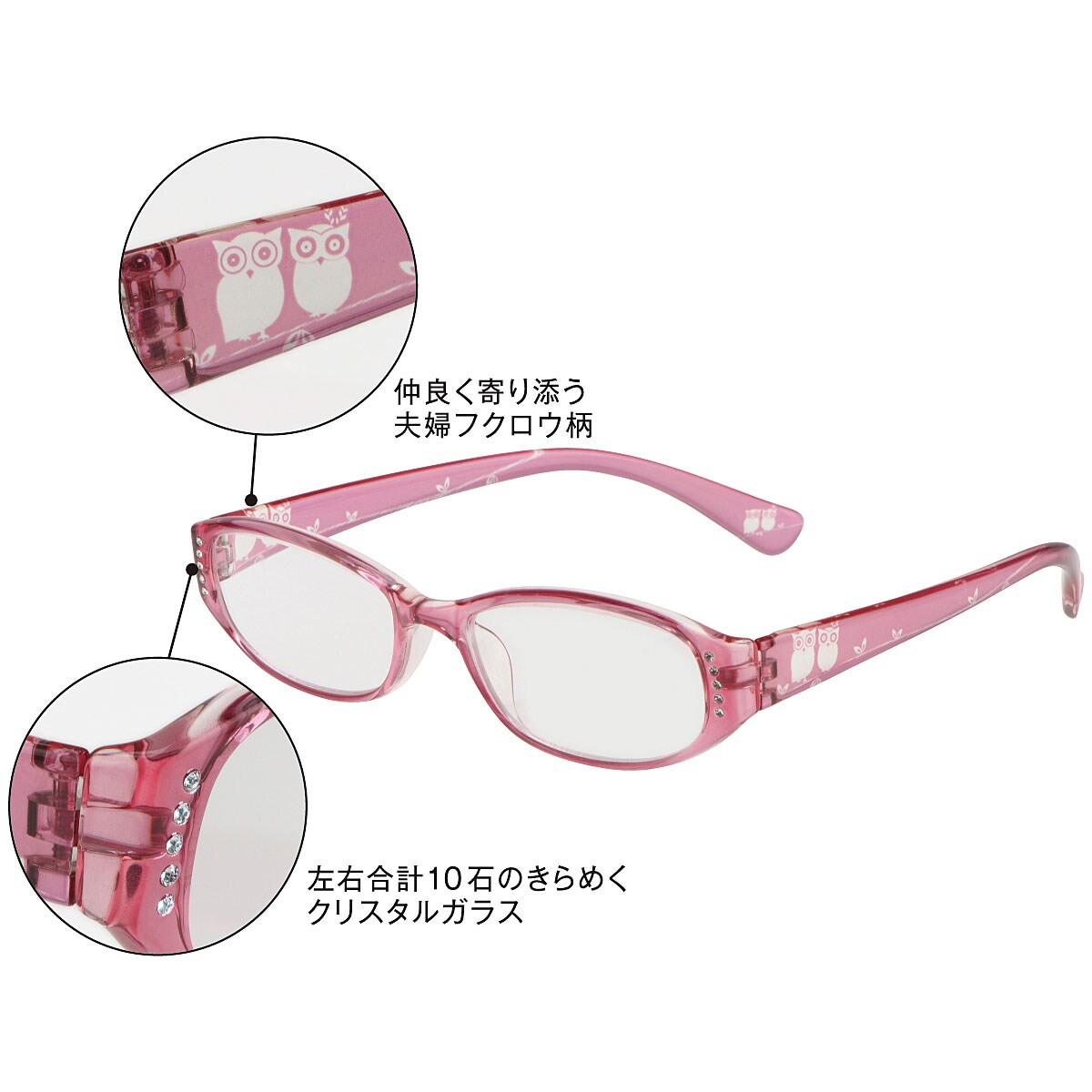 仲良く寄り添う夫婦フクロウがデザインされたシニアグラス。フレームの端には左右合計10石のきらめくクリスタルガラスが施されお顔も華やかに。しなやかで掛け心地が優しいフレームなので、本もスマホも読みやすい♪