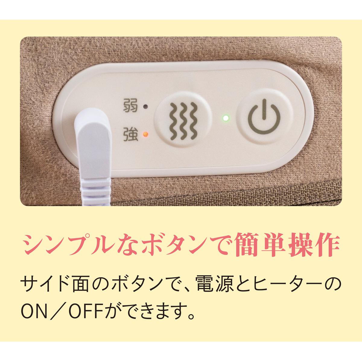 [本体表地]ポリエステル95%ポリウレタン5% [本体底生地]ポリエステル100% [本体中材]ウレタンフォーム [基板ケース]ABS樹脂 [操作部]ABS樹脂 [絶縁シート]熱可塑性エラストマー ■サイズ(約cm)/[本体]46×37×高さ8 [絶縁シート]40×30×厚さ0.3■重量(約g)/[本体]800 [絶縁シート]50■電源/AC100V■電源コード長さ/約1.8m■タイマー(約時間)/[電位治療]6 [ヒーター]1■ヒーター温度(約℃)/[弱]41 [強]45■セット内容/本体、絶縁シート、ACアダプター■販売名/フェムオンテック 暖クッション【管理医療機器】●中国製【保証書付1年間】(本体のみ)■□ご使用いただけない方について□■次のような方はご使用いただけませんので、ご注意ください。●ペースメーカー、植込み型除細動器などの電磁障害の影響を受けやすい体内植込み型医用電気機器を使用されている方●心電計などの装着形の医用電気機器を使用されている方●心臓病と診断された方や、日常の過激な運動を制限されている方■□次のようの方は医師にご相談のえご使用ください□■●急性疾患の方●悪性腫瘍のある方●体温38℃以上(有熱期)の方例1:急性炎症症状[けん(倦)怠感、悪寒、血圧変動など]の強い時期例2:衰弱しているとき●心臓に障害のある方●妊娠初期の不安定期又は出産直後の方●安静を必要とする方●温度感覚喪失が認められる方●せきつい(脊椎)の骨折、ねんざ(捻挫)、肉離れなど、急性[とう(疼)痛性]疾患の方●糖尿病などによる高度な末しょう(梢)循環障害からくる知覚障害のある人●高血圧の方●不整脈のある方●睡眠時無呼吸症の方●ぜん(喘)息の方●その他、医師の診断を受けている方や体に異常を感じている方