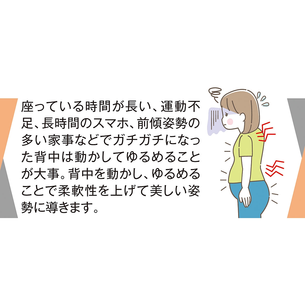 座っている時間が長い、運動不足、長時間のスマホ、前傾姿勢の多い家事などでガチガチになった背中は動かしてゆるめることが大事。