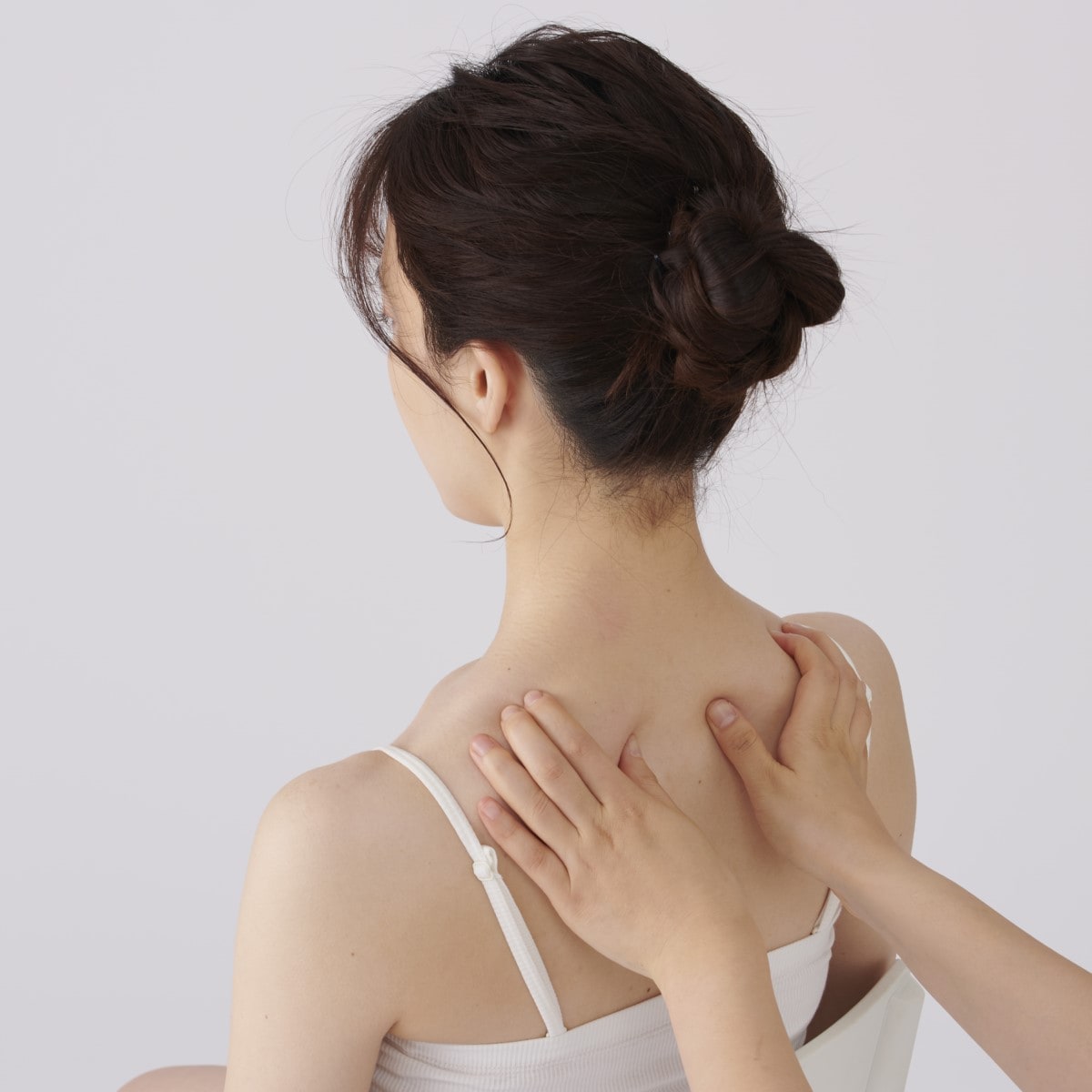 首から肩、肩甲骨周りにかけて背中側に広がる僧帽筋にアプローチします。