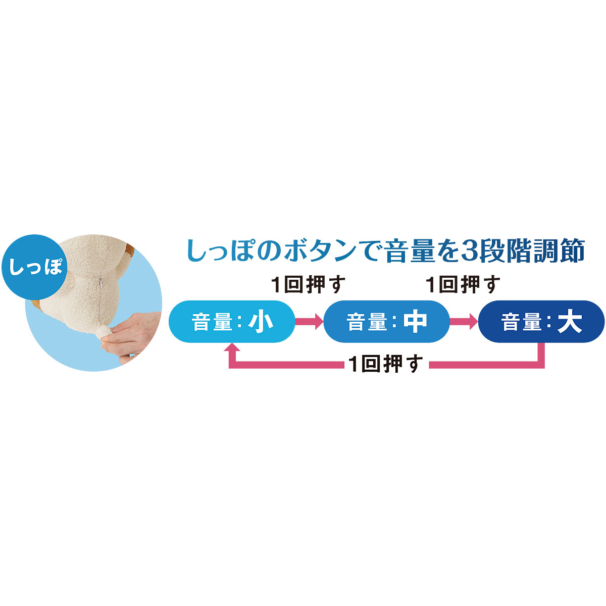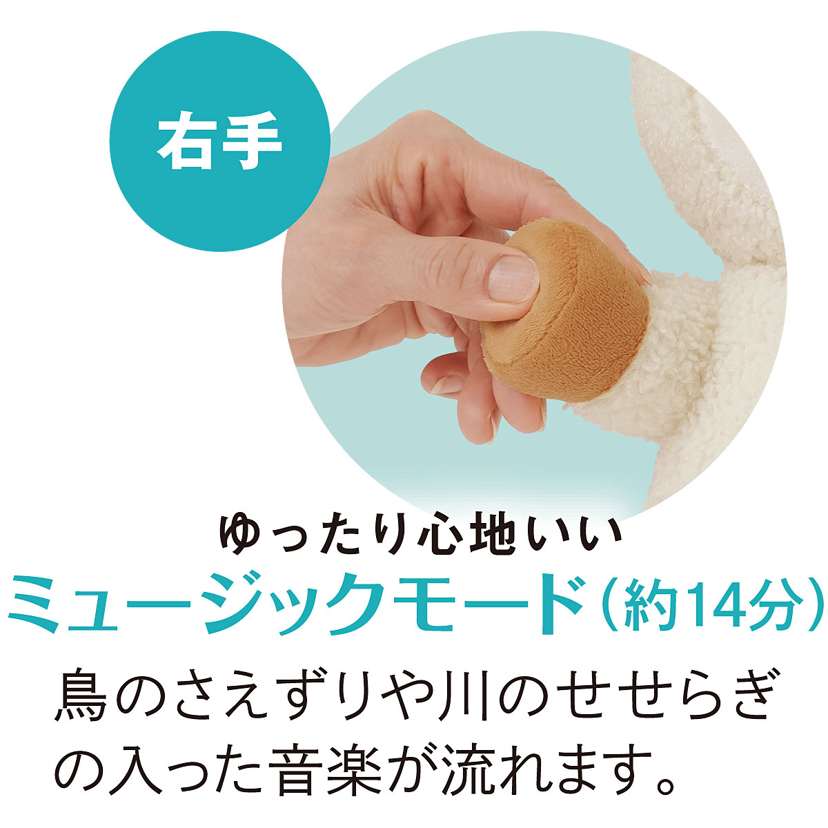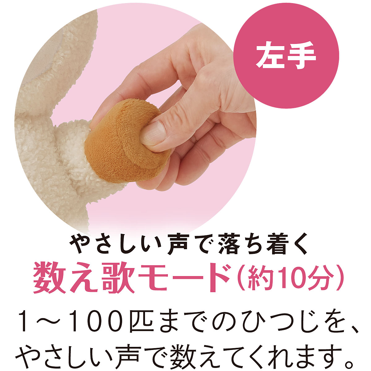 かわいい手をポチッとにぎっておやすみスイッチをON!【右手 ミュージックモード(約14分)】鳥のさえずりや川のせせらぎの入った音楽が流れます。【左手 数え歌モード(約10分)】1~100匹までのひつじを、やさしい声で数えてくれます。