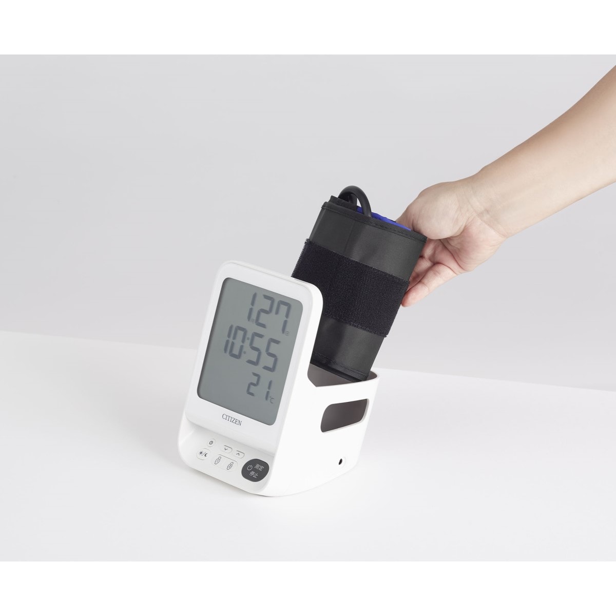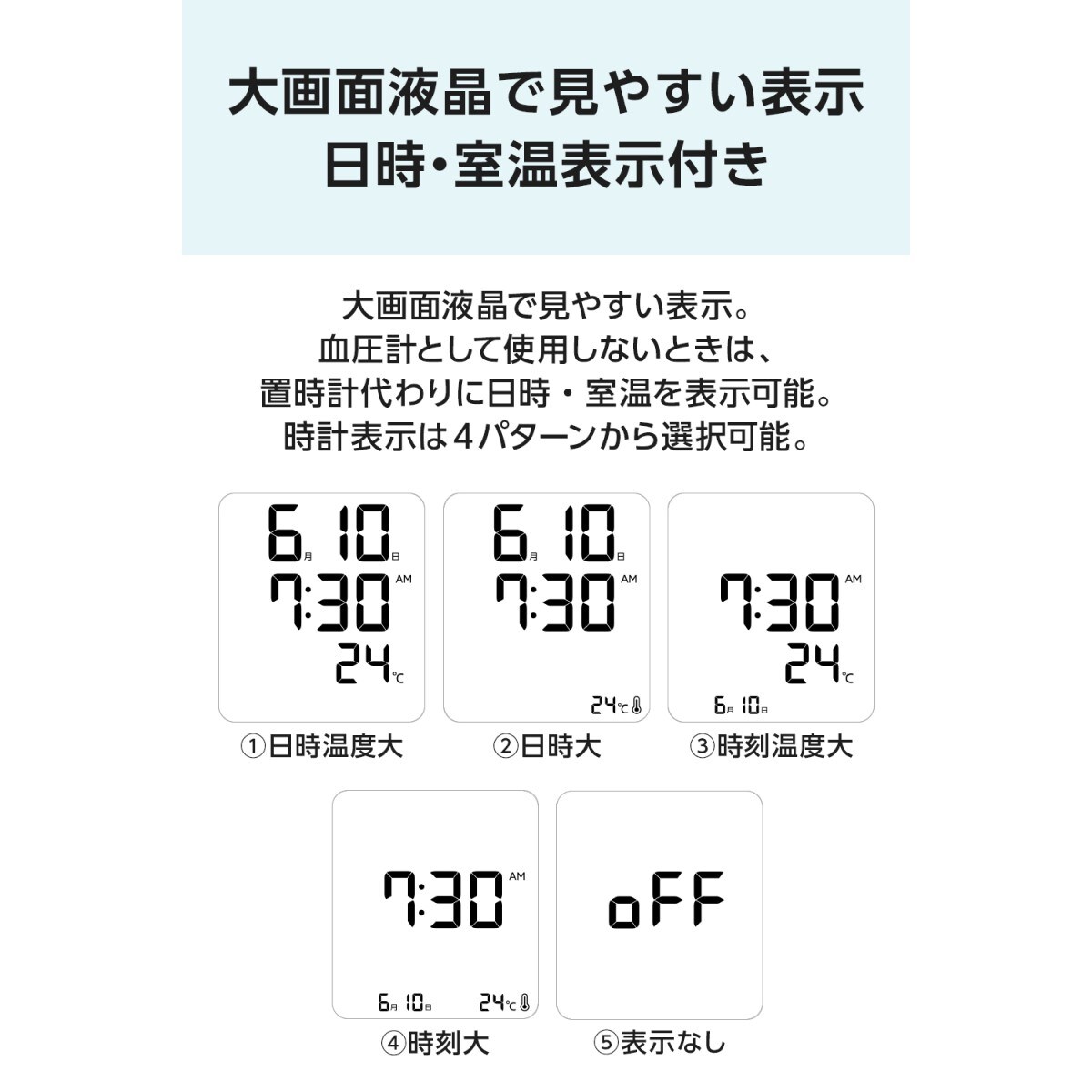 <<毎日の測定を手軽に継続できる>>使用しないときは時計になる!カフが収納できるから置き場に困りません。時計と気温表示機能が付いた血圧計で、継続的に測定を!