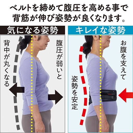 ベルトを締めて腹圧を高めることで背筋が伸び、姿勢が良くなります。※着用感には個人差があります。