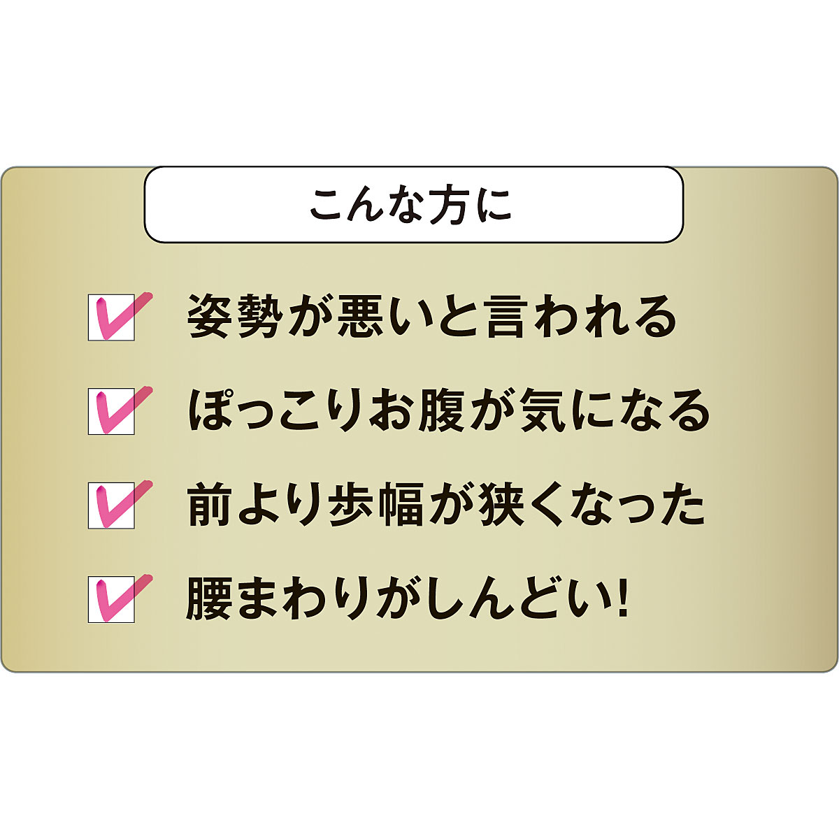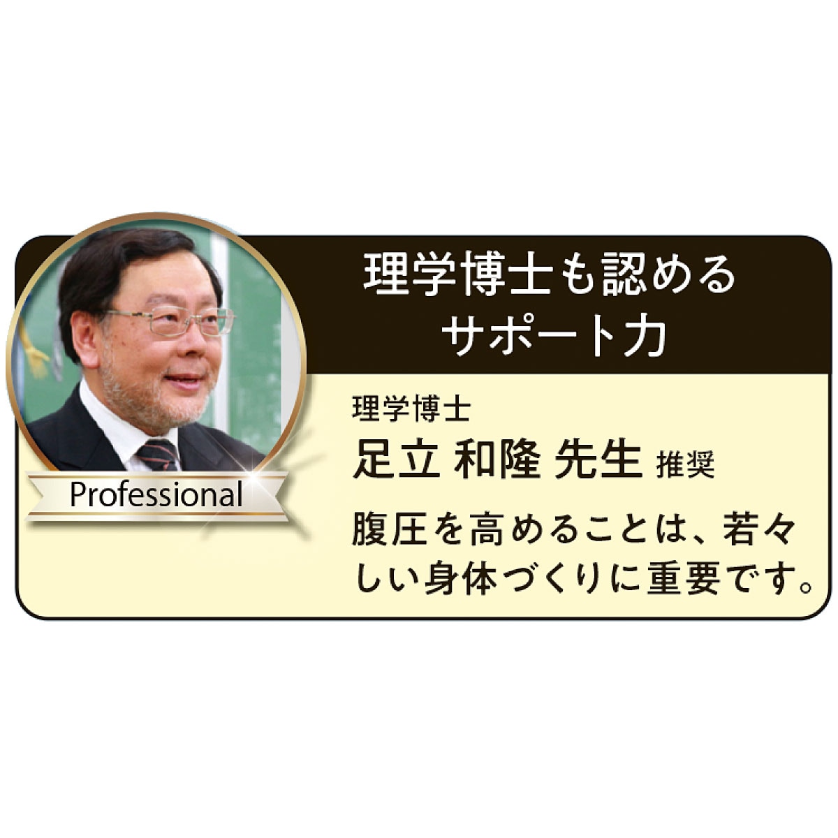 年齢に負けないカラダづくりは「腹圧」に注目! 少しの力でキュッと締まって支えてくれるベルトです。10個の滑車でラクに引き締め、着けやすく調節しやすいのが特長。ベルトを締めて腹圧を高めることで背筋が伸び、姿勢が良くなります。姿勢が悪いと言われる方、ぽっこりお腹が気になる方、前より歩幅が狭くなった方、腰まわりがしんどい方におすすめです。