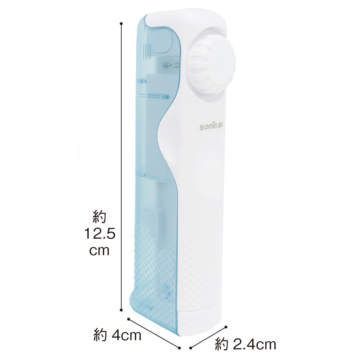 ■サイズ(約cm)/幅4×奥行2.4×高さ12.5■重量(約g)/60(電池含まず)■電源/単4アルカリ乾電池1本(別売)■電池寿命/約5時間■装着可能ブラシサイズ目安(約cm)/縦1.4×横1.4以内のもの※歯ブラシは商品に含まれません。●中国製【保証書付1年間】 【交換・返品不可】