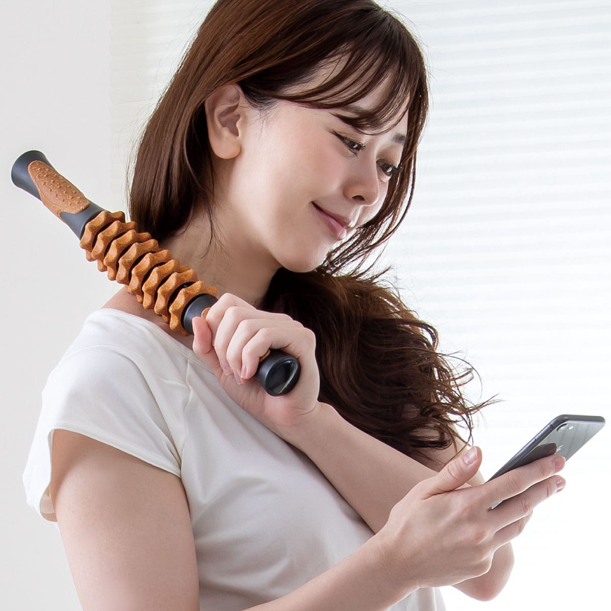 インテリアに馴染むコルク調デザインのほぐしスティックローラー。片手でコロコロできるサイズ感で、ながらでできる簡単ボディケア!凝り固まった筋肉をほぐし、溜まった老廃物を流してスッキリ!首・肩・腰・背中・太もも・二の腕・足裏など使い方色々◎