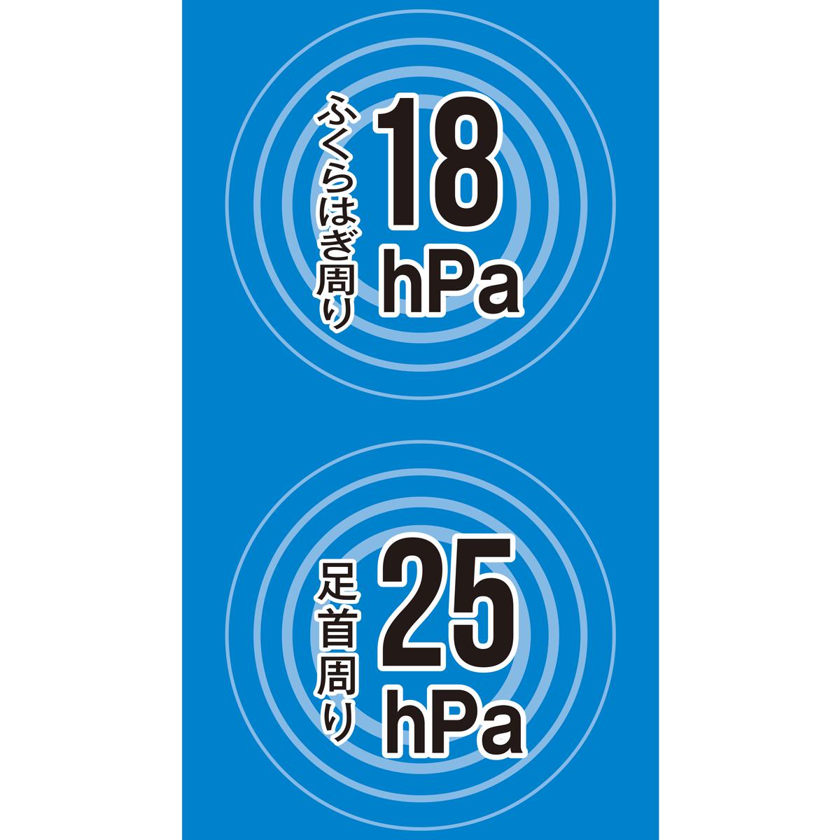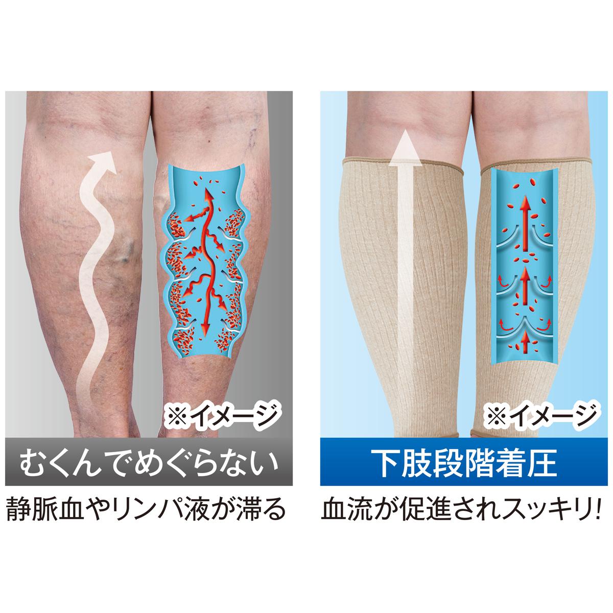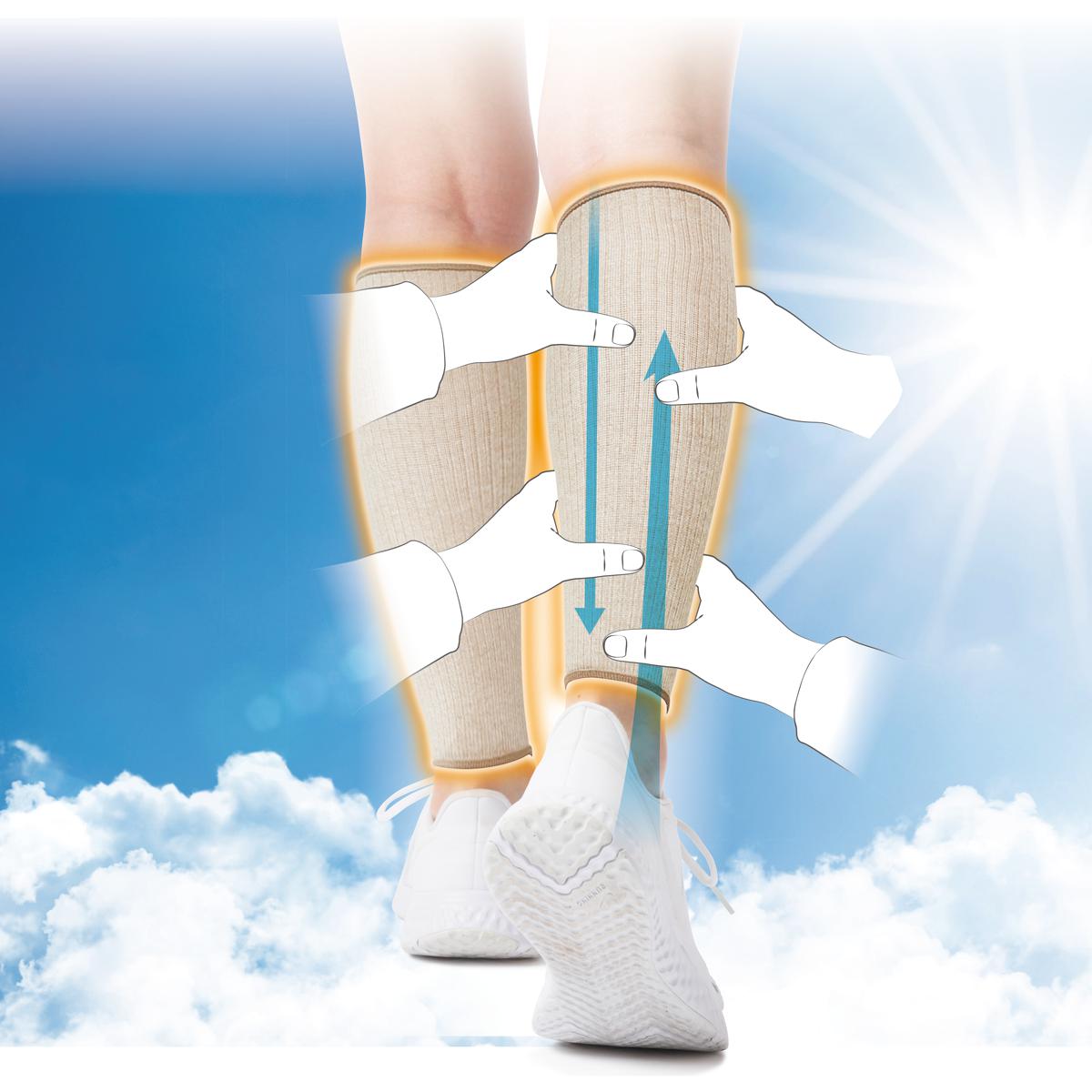 整体段階着圧で昼間下半身に溜まりやすい水分をめぐらせスッキリ!強着圧部の足首からしっかりひきしめ、中着圧部のふくらはぎを程よくサポート。昼間にバランスの良い段階着圧設計でむくみを軽減すると共に下肢に溜まった水分を上半身に戻すサポーターです。