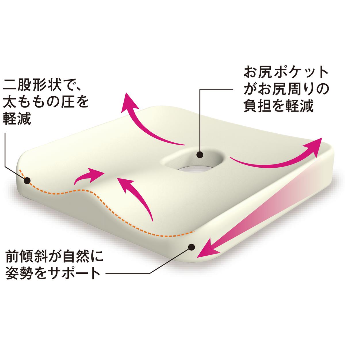 しっかり沈み込む低反発素材が、座った時の圧力を分散!前傾斜が自然と姿勢を意識させ、背筋ピーンをサポートします。低反発ウレタンが体重を受け止め、中心部のお尻ポケットに向かってゆっくりと沈み込むため、体圧を分散して長時間座っていても快適!!