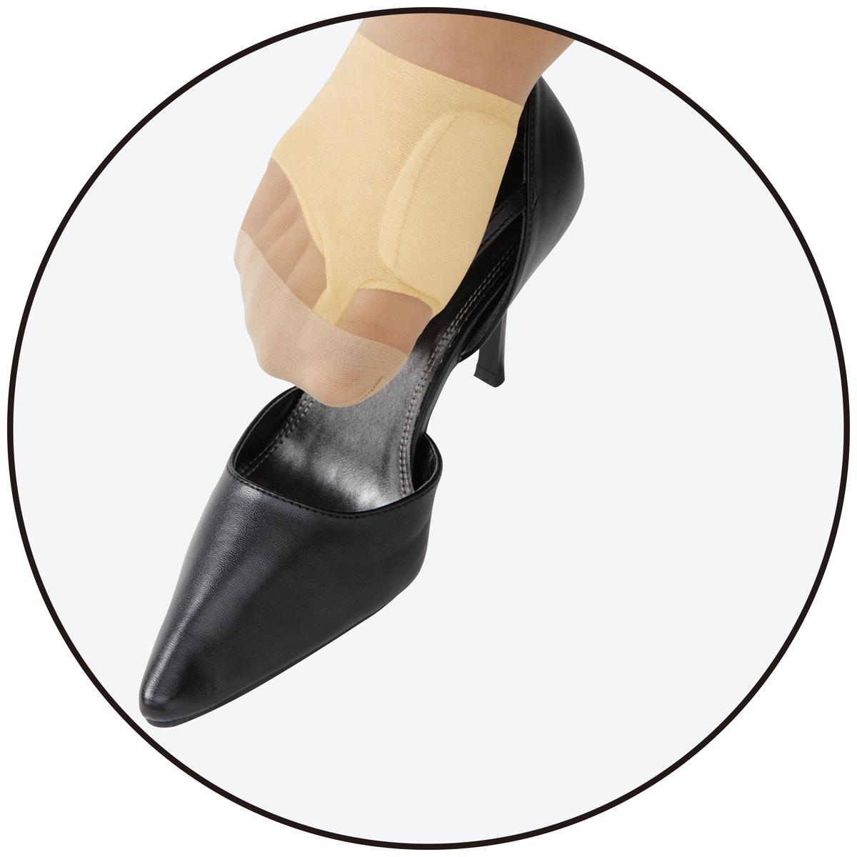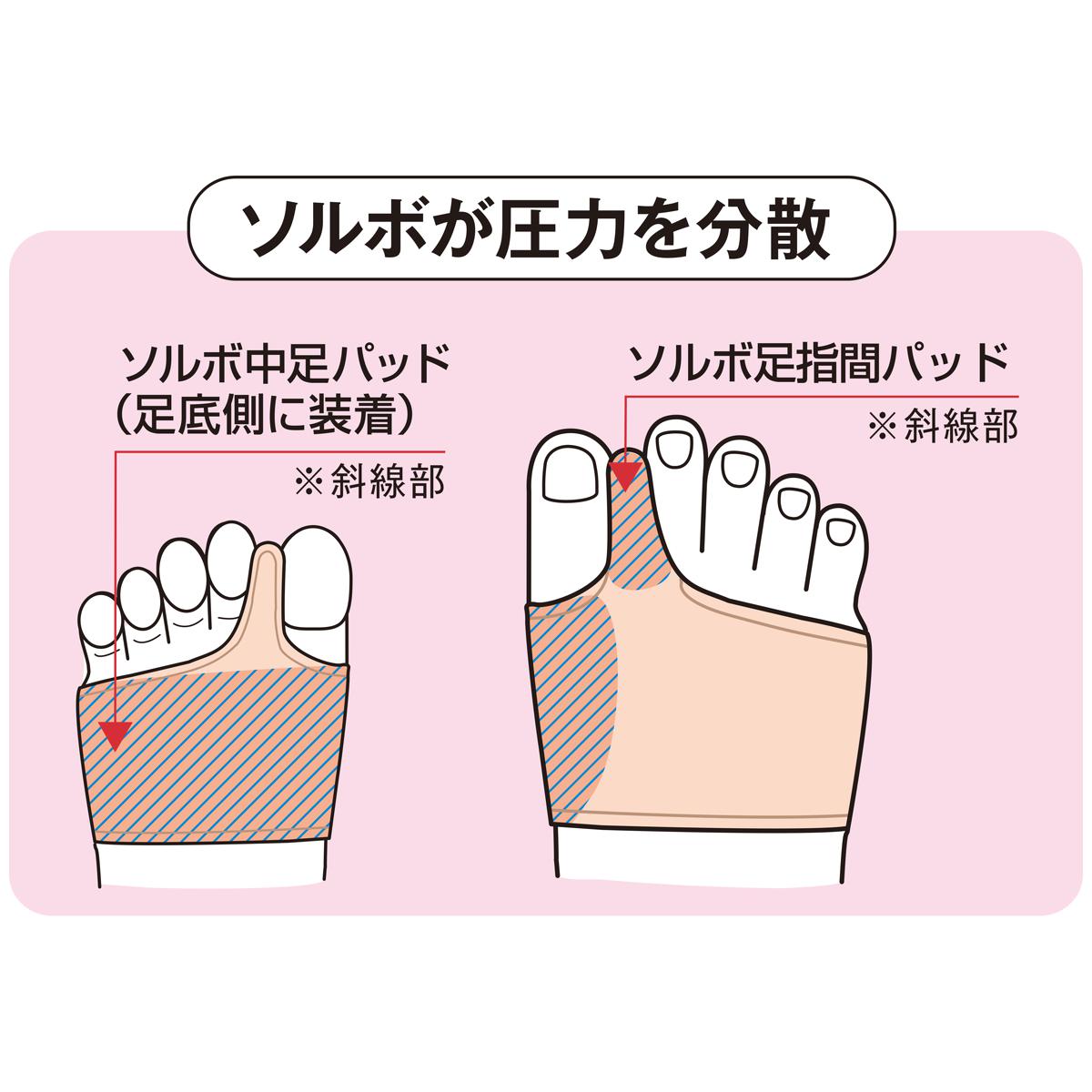 「ソルボセイン」が圧力を分散して足の負担を少なくするから、長時間の使用も快適に。本体生地はフィット感があり、ムレにくい薄型パワーネット。伸びるから履きやすく、薄型だから靴がそのまま履ける!こんな方におすすめ!□ 外反母趾で靴を履いて歩くのが辛い□ 足の裏にタコや足まめがある□ 親指の付け根が辛い