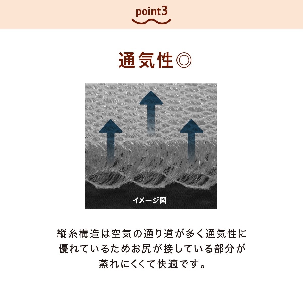 縦糸構造は空気が通りやすいため、蒸れにくく快適です。縦糸構造がお尻の形状に合わせてフィットし、お尻をサポートします。