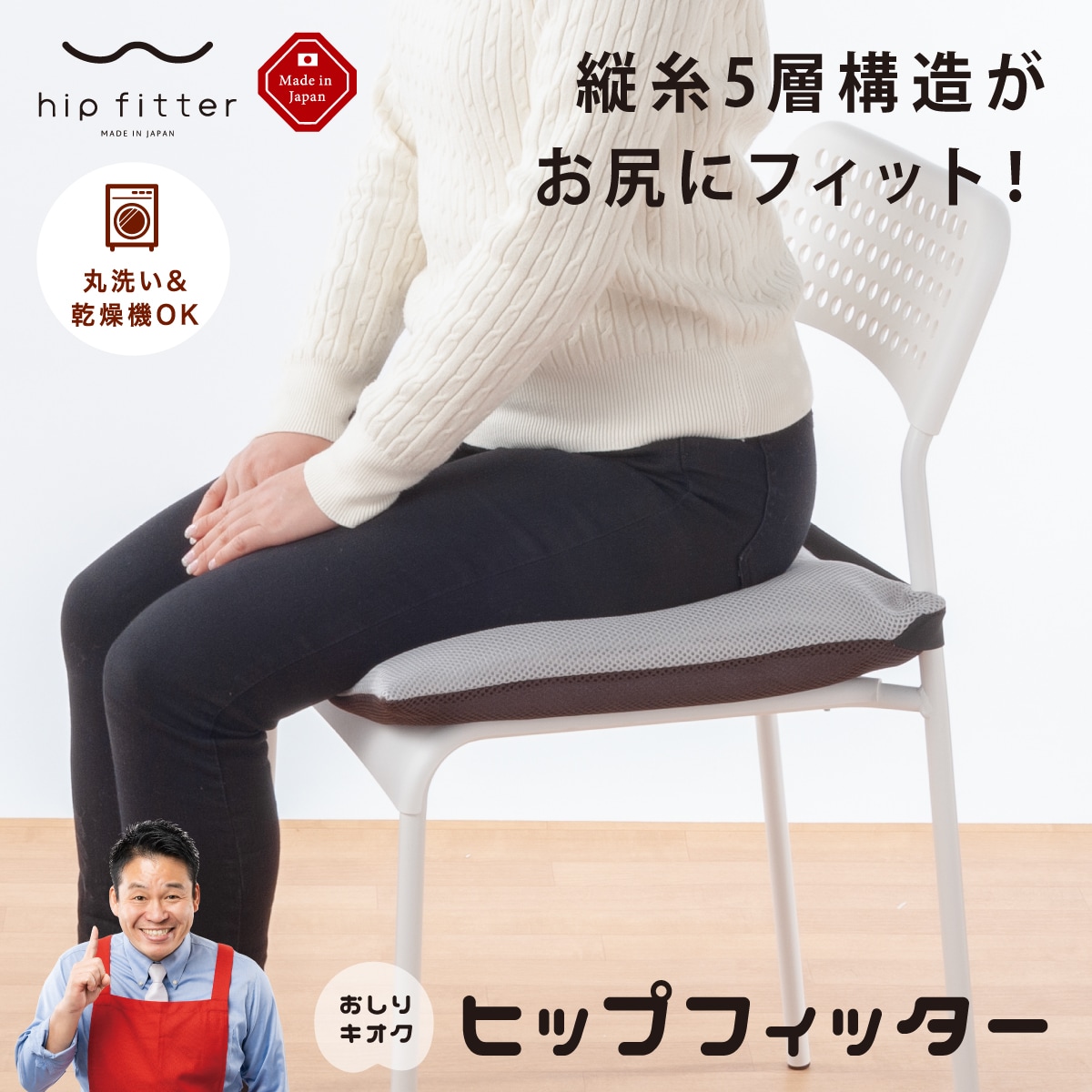 実演販売士レジェンド松下さんプロデュース!縦糸5層構造がお尻にフィット!縦糸の5層構造がおしりの形状に合わせて骨盤をサポート。空気の通り道が多く通気性に優れているためお尻が接している部分が蒸れにくくて快適です。ご家庭の洗濯機で丸洗い・乾燥ができるので、清潔にお使いいただけます。熱を加えると復元する性質のため、洗濯後に乾燥機をお使いいただくとふんわり感がよみがえります。乾燥機をご使用されない場合は、ドライヤーの温風を当てていただくと同様の効果が得られます。