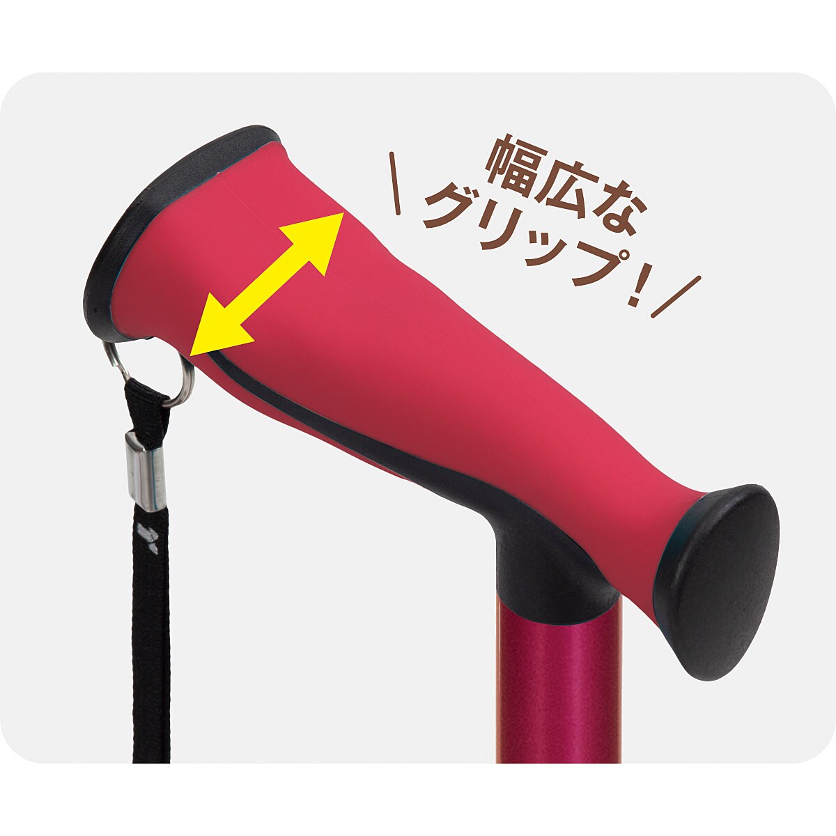 グリップが幅広で安定感があるワイドステッキ!手への負担をサポートする幅広グリップで安定感があり、歩行もラクラク。
