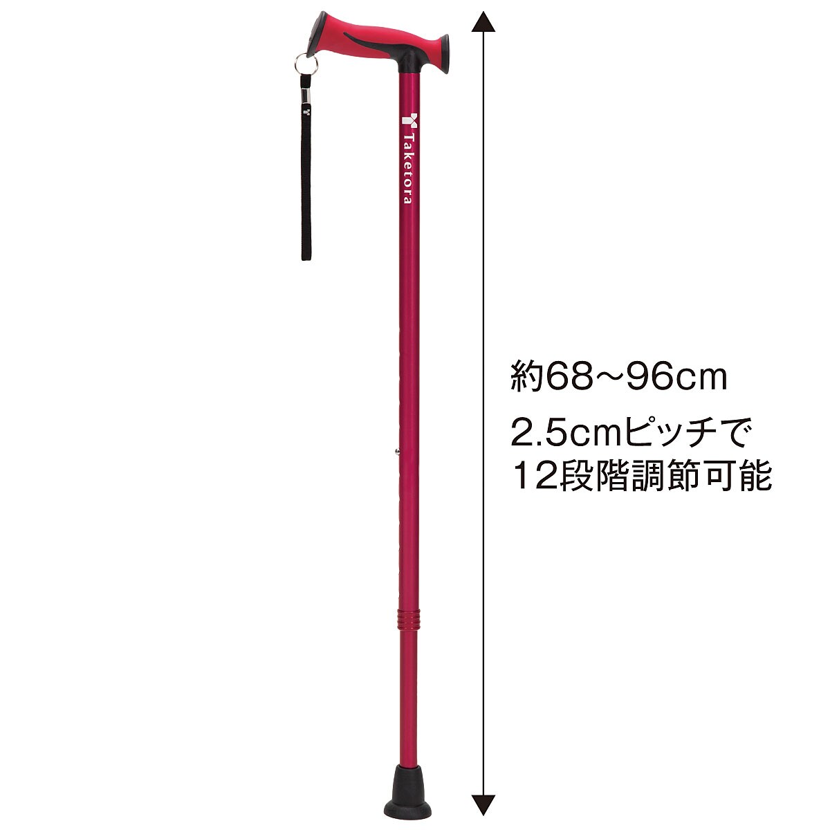 ■[本体]アルミニウム[握り手]TPR、PP[ストラップ]ポリエステル[杖先]TPR■サイズ(約cm)/[全長]68~96(12段階、ピッチ2.5)■適応サイズ/[身長]130~186cm■重量(約g)/390※この杖は、杖なしで自立歩行できる方がより安定して歩行できるよう補助的に使用するものです。以下の方はステッキを使用しないでください。杖なしでは歩行が困難な方。リハビリ中の方。●台湾製