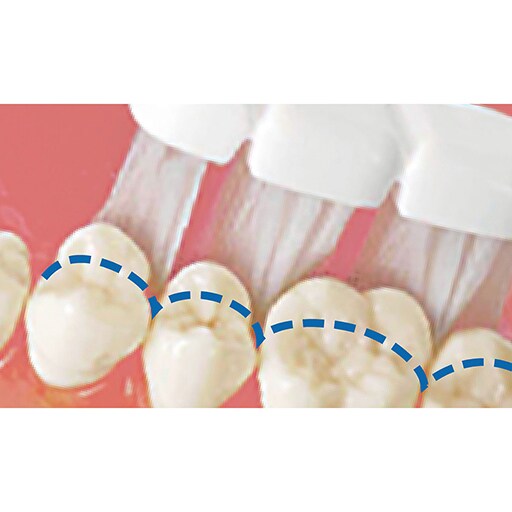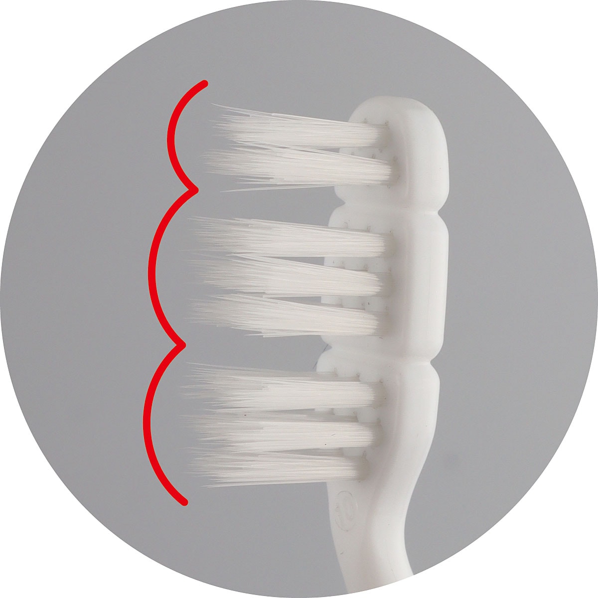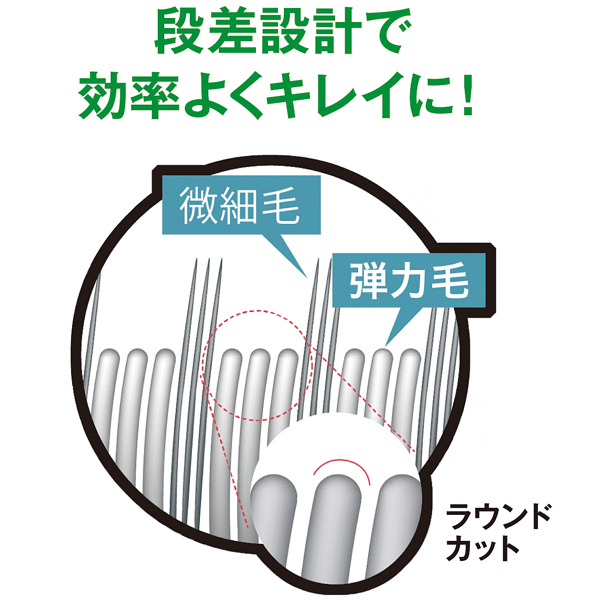 長さと太さが異なる二種類の毛が効率的に汚れを落とします。ラウンドカット仕様で歯茎への負担軽減!