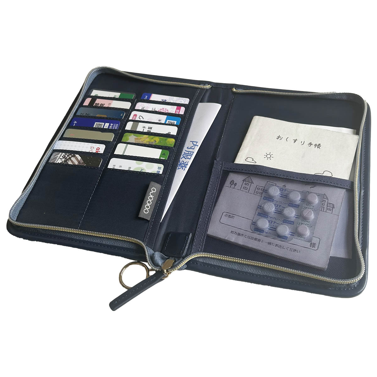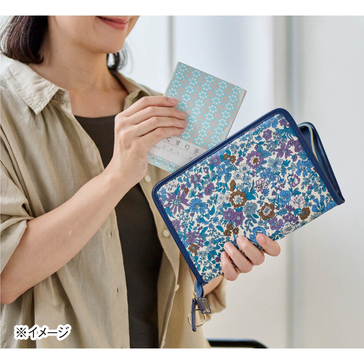 中身が飛び出しにくいラウンドファスナー仕様で、大容量のカードポケットが便利なお薬手帳ポーチ。世界中で愛され続けているリバティ・ファブリックスの柄がオシャレ。