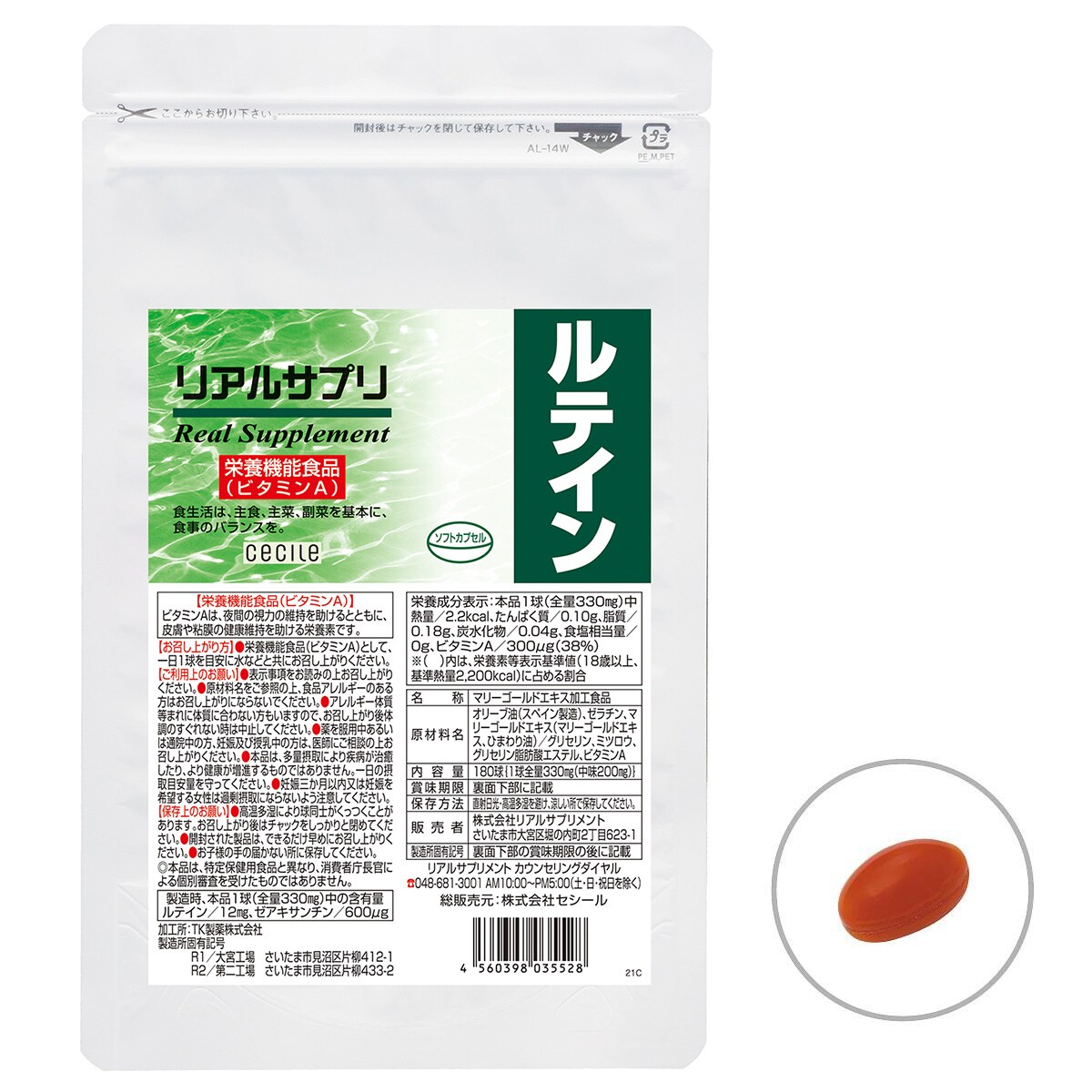 ■内容量M:330mg(内容量200mg)×30球(約30日分)LL:330mg(内容量200mg)×180球(約180日分)●1日の目安/1球●主要成分(1球当たり)/ルテイン12mg、ゼアキサンチン/600μg、ビタミンA/300μg※原材料の一部にゼラチンが含まれます。●栄養機能食品(ビタミンA)ビタミンAは、夜間の視力の維持を助け、皮膚や粘膜の健康維持を助ける栄養素です。●原材料/オリーブ油(スペイン製造)、ゼラチン、マリーゴールドエキス(マリーゴールドエキス、ひまわり油)/グリセリン、ミツロウ、グリセリン脂肪酸エステル、ビタミンAリアルサプリ・リアルエクセレントシリーズはすべて国内工場で製造しております。※商品の特性上、返品・交換はお受けできません。