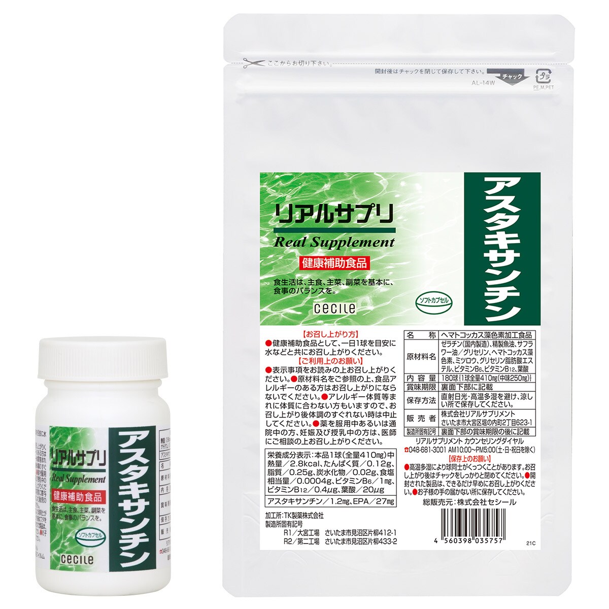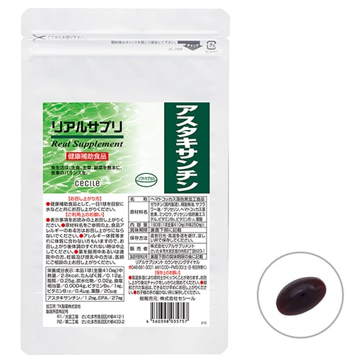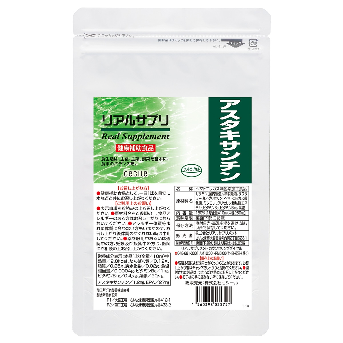 ■内容量M:410mg(内容量250mg)×30球(約30日分)LL:410mg(内容量250mg)×180球(約180日分)●1日の目安/1球●主要成分(1球当たり)/アスタキサンチン 1.2mg、EPA 27mg、ビタミンB6 1.0mg、ビタミンB12 0.4μg、葉酸 20μg※原材料の一部にゼラチンが含まれます。●原材料ゼラチン(国内製造)、精製魚油、サフラワー油/グリセリン、ヘマトコッカス藻色素、ミツロウ、グリセリン脂肪酸エステル、ビタミンB6、ビタミンB12、葉酸リアルサプリ・リアルエクセレントシリーズはすべて国内工場で製造しております。※商品の特性上、返品・交換はお受けできません。