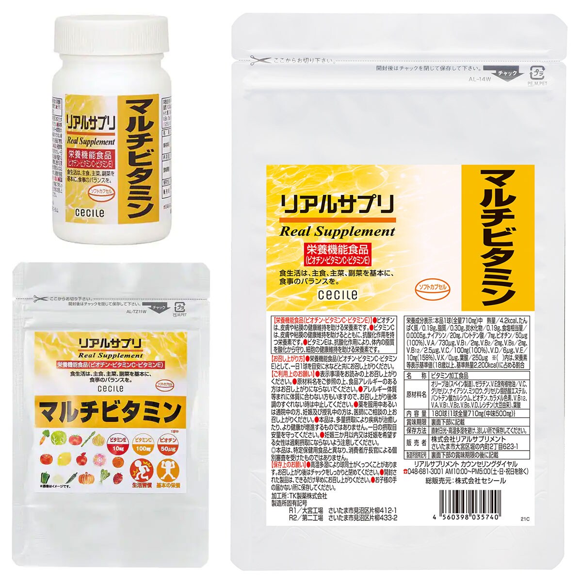 ■内容量M :710mg(内容量500mg)×30球(約30日分)LL:710mg(内容量500mg)×180球(約180日分)●1日の目安/1球●主要成分(1球当たり)/ナイアシン 20mg、パントテン酸 7mg、ビオチン 50μg、ビタミンA 730μg、ビタミンB1 2mg、ビタミンB2 2mg、ビタミンB6 2mg、ビタミンB12 2.5μg、ビタミンC 100mg、ビタミンD 6μg、ビタミンE 10mg、ビタミンK 0μg、葉酸250μg※原材料の一部にゼラチン・大豆が含まれます。●栄養機能食品(ビオチン、ビタミンC、ビタミンE)・ビオチンは、皮膚や粘膜の健康維持を助ける栄養素です。・ビタミンCは、皮膚や粘膜の健康維持を助けるとともに、抗酸化作用を持つ栄養素です。・ビタミンEは、抗酸化作用により、体内の脂質を酸化から守り、細胞の健康維持を助ける栄養素です。●原材料/オリーブ油(スペイン製造)、ゼラチン、V.E含有植物油/V.C、グリセリン、ナイアシン、ミツロウ、グリセリン脂肪酸エステル、パントテン酸カルシウム、ビオチン、カラメル色素、V.B12、V.A、V.B1、V.B2、V.B6、V.D、レシチン(大豆由来) 、葉酸リアルサプリ・リアルエクセレントシリーズはすべて国内工場で製造しております。※商品の特性上、返品・交換はお受けできません。