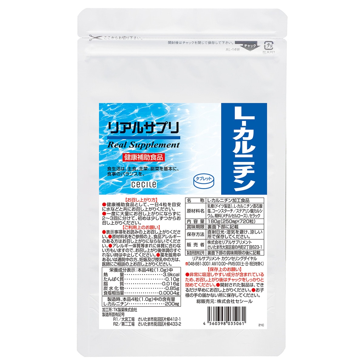 ■内容量M:250mg×120粒(約30日分)LL:250mg×720粒(約180日分)●1日の目安/4粒●主要成分(4粒当たり)/L-カルニチン 200mg※原材料の一部に乳が含まれます。●原材料/乳糖(ドイツ製造)、L-カルニチン酒石酸塩、コーンスターチ/ステアリン酸カルシウム、糊料(メチルセルロース)、セラックリアルサプリ・リアルエクセレントシリーズはすべて国内工場で製造しております。※商品の特性上、返品・交換はお受けできません。