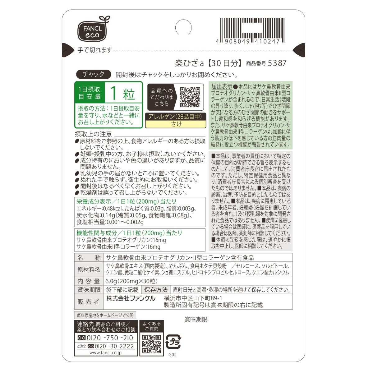 日常生活(階段の昇り降り、歩く、しゃがむ等)でひざ調節が気になる方に適しています。また、加齢に伴う筋力の低下を感じている方の筋力量の維持に役立つ機能※2が報告されています。※1 膝関節の違和感を和らげる機能は本品による臨床試験で確認。※2 加齢に伴う筋力の低下を感じている方の筋肉量の維持に役立つ機能はサケ鼻軟骨由来プロテオグリカン・サケ鼻軟骨由来Ⅱ型コラーゲンによる研究報告。■内容量(1袋当たり)/200mg×30粒(約30日分)●1日の目安/1粒●機能性関与成分/サケ鼻軟骨由来プロテオグリカン、サケ鼻軟骨由来Ⅱ型コラーゲン【原材料】サケ鼻軟骨エキス(国内製造)、でんぷん、食用ホタテ貝殻粉/セルロース、ソルビトール、クエン酸、微粒二酸化ケイ素、ショ糖エステル、ヒドロキシプロピルセルロース、クエン酸カルシウム※原材料の一部にさけが含まれます。※妊娠・授乳中の方、お子様はお召し上がりにならないでください。■機能性表示食品/届出番号:I1216【機能性表示食品とは】事業者の責任において特定の保健の目的が期待できる旨を表示するものとして、消費者庁長官に届出されたものです。※消費者庁長官による個別審査を受けたものではありません。※疾病の診断、治療、予防を目的としたものではありません。※食生活は主食、主菜、副菜を基本に、食事のバランスを。※商品の特性上、返品・交換はお受けできません。※パッケージのデザインが変更になる場合がございます。