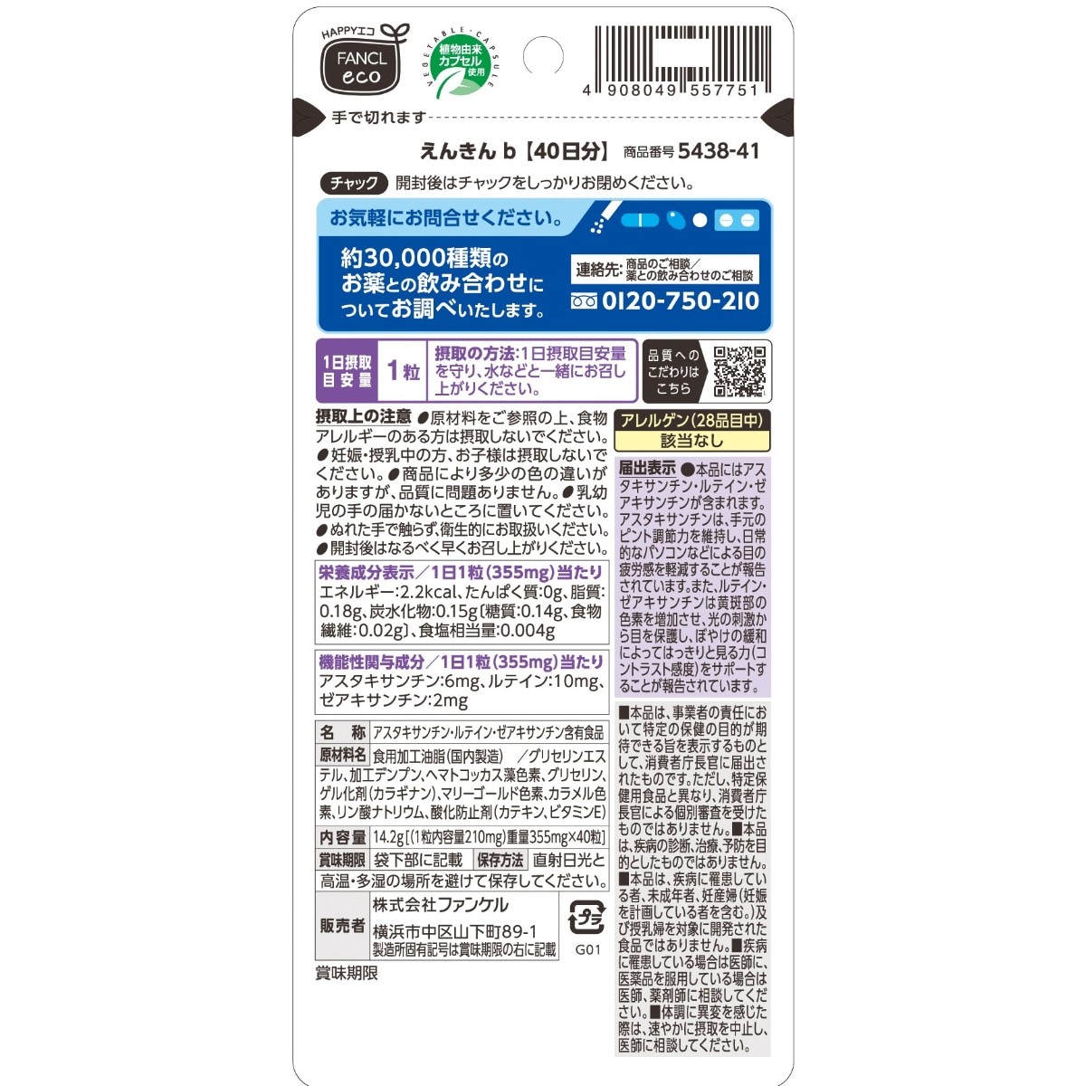■内容量(1袋当たり)/355mg×40粒(約40日分) ●1日の目安/1粒●機能性関与成分/アスタキサンチン、ルテイン、ゼアキサンチンアスタキサンチン:6mgルテイン:10mgゼアキサンチン:2mg【原材料】食用加工油脂(国内製造)/グリセリンエステル、加工デンプン、ヘマトコッカス藻色素、グリセリン、ゲル化剤(カラギナン)、マリーゴールド色素、カラメル色素、リン酸ナトリウム、酸化防止剤(カテキン、ビタミンE)※妊娠・授乳中の方、お子様はお召し上がりにならないでください。■機能性表示食品/届出番号:E700【機能性表示食品とは】事業者の責任において特定の保健の目的が期待できる旨を表示するものとして、消費者庁長官に届出されたものです。※消費者庁長官による個別審査を受けたものではありません。※疾病の診断、治療、予防を目的としたものではありません。※食生活は主食、主菜、副菜を基本に、食事のバランスを。※商品の特性上、返品・交換はお受けできません。