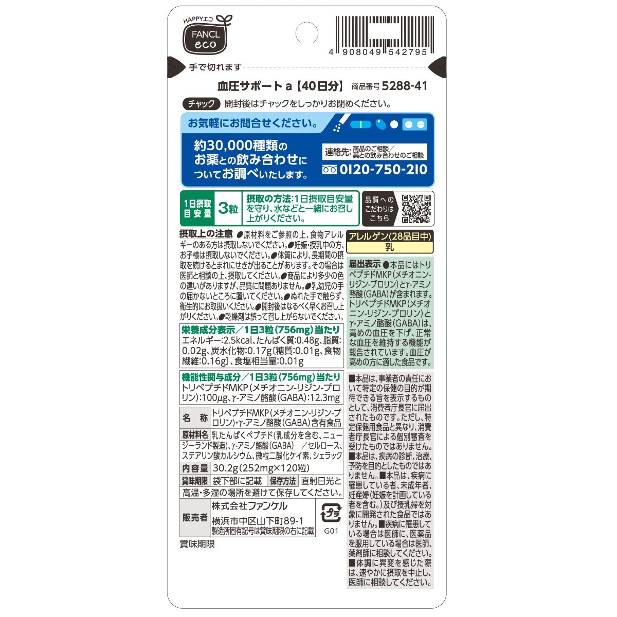 ■内容量(1袋当たり)/252mg×120粒(約40日分)●1日の目安/3粒●機能性関与成分/トリペプチドMKP(メチオニン-リジン-プロリン)、γ-アミノ酪酸(GABA)【原材料】乳たんぱくペプチド(乳成分を含む、ニュージーランド製造)、γ―アミノ酪酸(GABA) 、セルロース、ステアリン酸カルシウム、微粒二酸化ケイ素、シェラック※原材料の一部に、乳が含まれます。※妊娠・授乳中の方、お子様はお召し上がりにならないでください。※体質により、長期間の摂取を続けるとまれにせきが出ることがあります。■機能性表示食品/届出番号:E493【機能性表示食品とは】事業者の責任において特定の保健の目的が期待できる旨を表示するものとして、消費者庁長官に届出されたものです。※消費者庁長官による個別審査を受けたものではありません。※疾病の診断、治療、予防を目的としたものではありません。※食生活は主食、主菜、副菜を基本に、食事のバランスを。※商品の特性上、返品・交換はお受けできません。