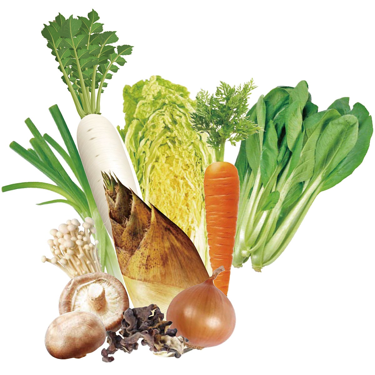 白菜、玉ねぎ、にんじん、小松菜、大根、長ねぎ、たけのこ、椎茸、えのき、きくらげ