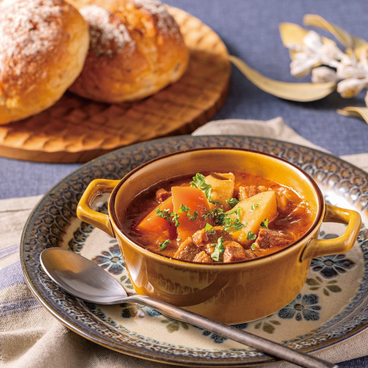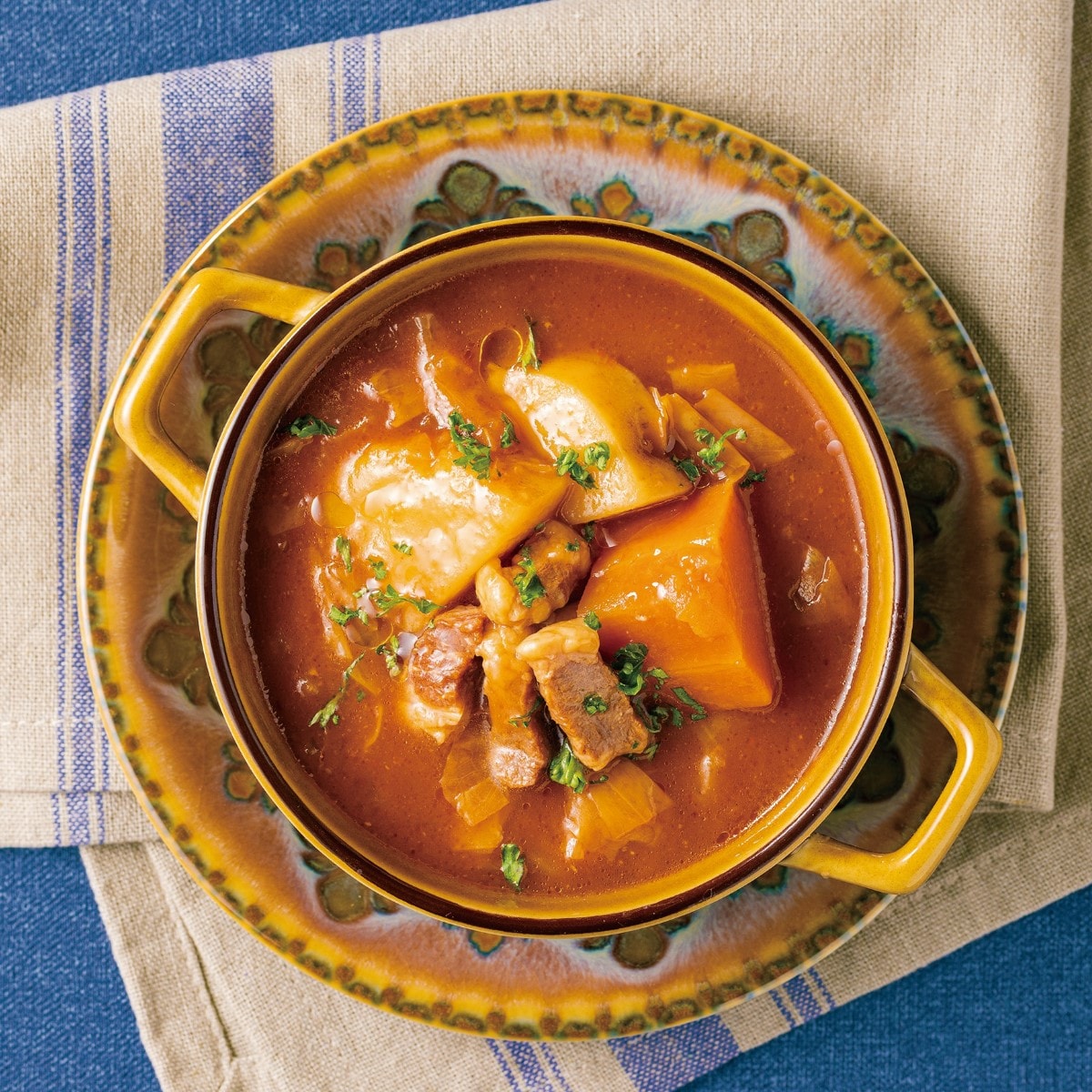 メインにぴったり! ごろっと大きい野菜と牛肉の旨味が溶けだしたごちそうボルシチです。プチ贅沢なひとりごはんにもおすすめ。