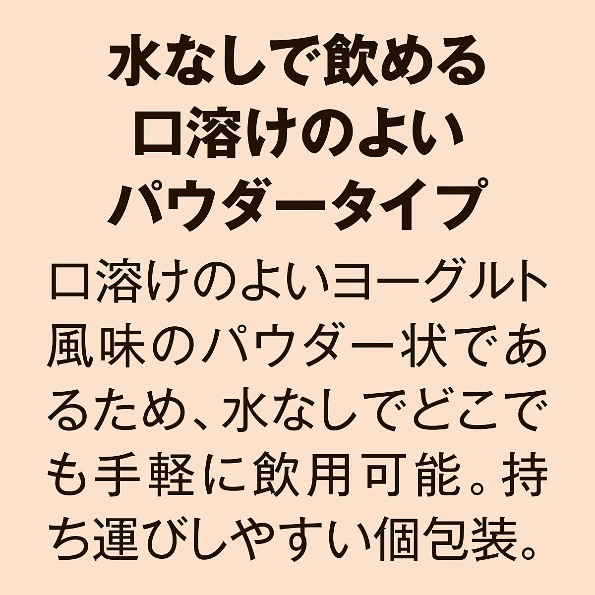 口溶けのよいヨーグルト風味のパウダー状であるため、水なしでどこでも手軽に飲用可能。持ち運びしやすい個包装。