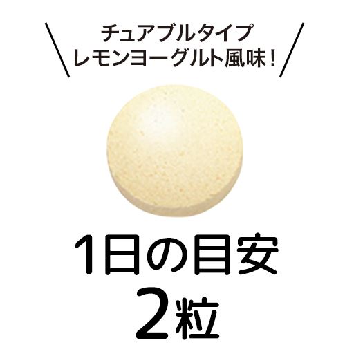 ビタミンCやビタミンDも1日摂取目安量を配合した、独自の炭酸発泡するチュアブルタイプです。噛むことでレモンヨーグルトの風味の泡が広がり、口の中がおいしく爽やかに潤います。