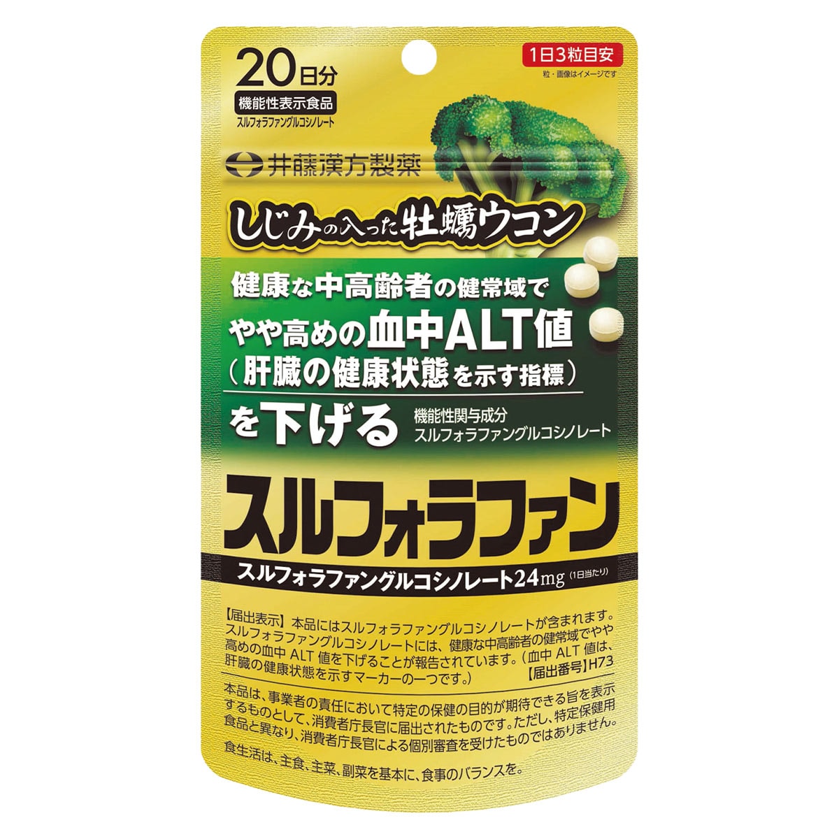 ■内容量/60粒(約20日分) ●1日の目安/3粒 ●機能性関与成分/スルフォラファングルコシノレート24mg※原材料の一部に乳成分が含まれます。※商品の特性上、交換・返品はお受けできません。【原材料】乳糖(カナダ製)、ブロッコリー種子エキス(ブロッコリー種子抽出物、マルトデキストリン)、食物繊維加工品(オート麦ファイバー、寒天)、しじみエキス、ウコンエキス、牡蠣エキス■機能性表示食品/届出番号 : H73届出表示:本品にはスルフォラファングルコシノレートが含まれます。スルフォラファングルコシノレートには、健康な中高齢者の健常域でやや高めの血中ALT値を下げることが報告されています。(血中ALT値は、肝臓の健康状態を示すマーカーの一つです。)【機能性表示食品とは】事業者の責任において特定の保健の目的が期待できる旨を表示するものとして、消費者庁長官に届出されたものです。※消費者庁長官による個別審査を受けたものではありません。※疾病の診断、治療、予防を目的としたものではありません。※食生活は主食、主菜、副菜を基本に、食事のバランスを