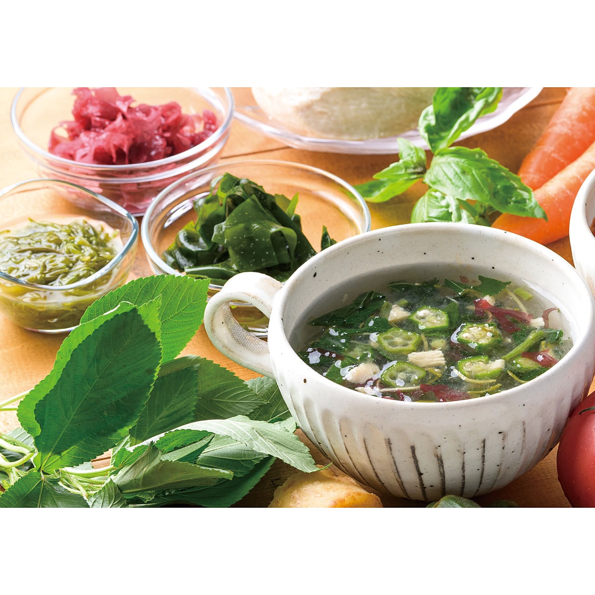 ●かつおだしと生姜を合わせた和風のあっさりとした味わいモロヘイヤ、オクラのねばねば野菜と海藻に鶏肉が入った具だくさんのスープです。かつおだしに生姜をきかせ、普段の食事に取り入れやすい味わいに仕上げました。