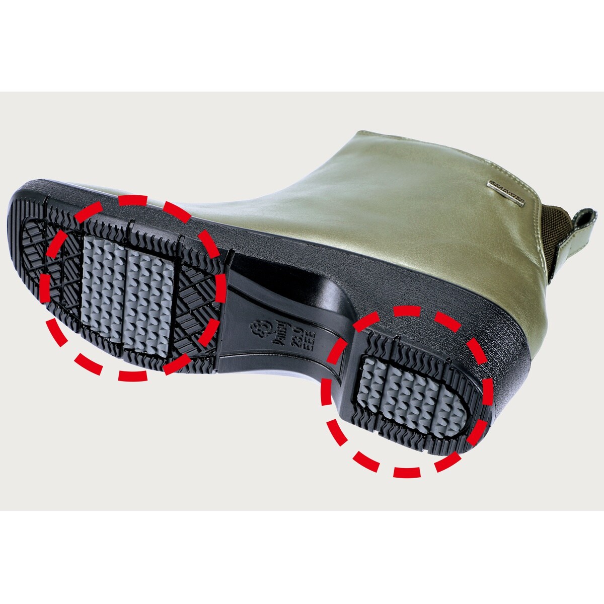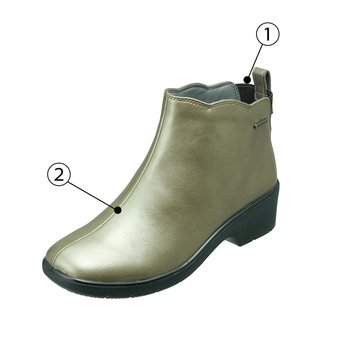 (1)かかとゴム&プルストラップで脱ぎ履きラク (2)縫い目は防水テープでガード