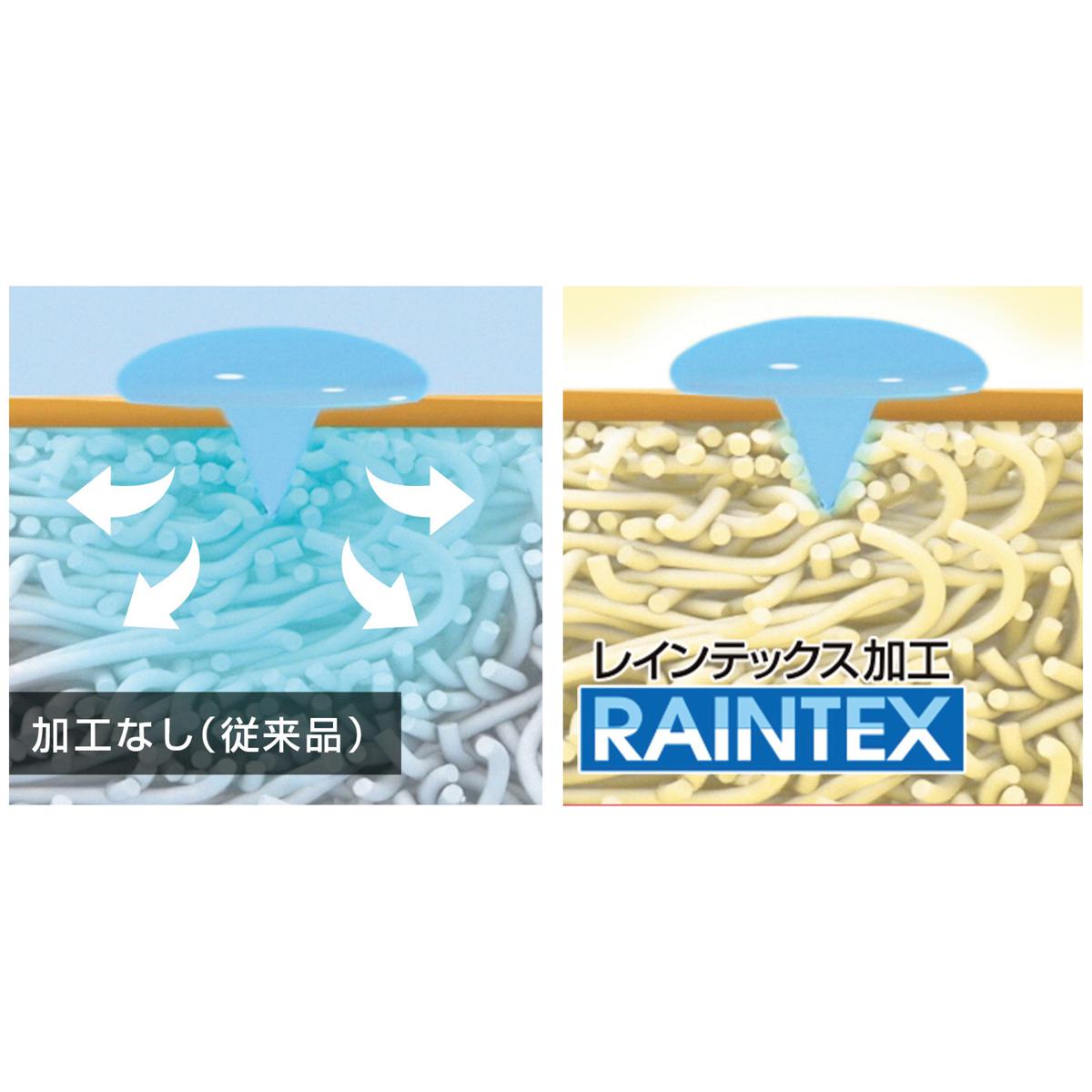 独自の防水技術「レインテックス加工」により、表面が濡れても内部まで水が浸みこみにくい。