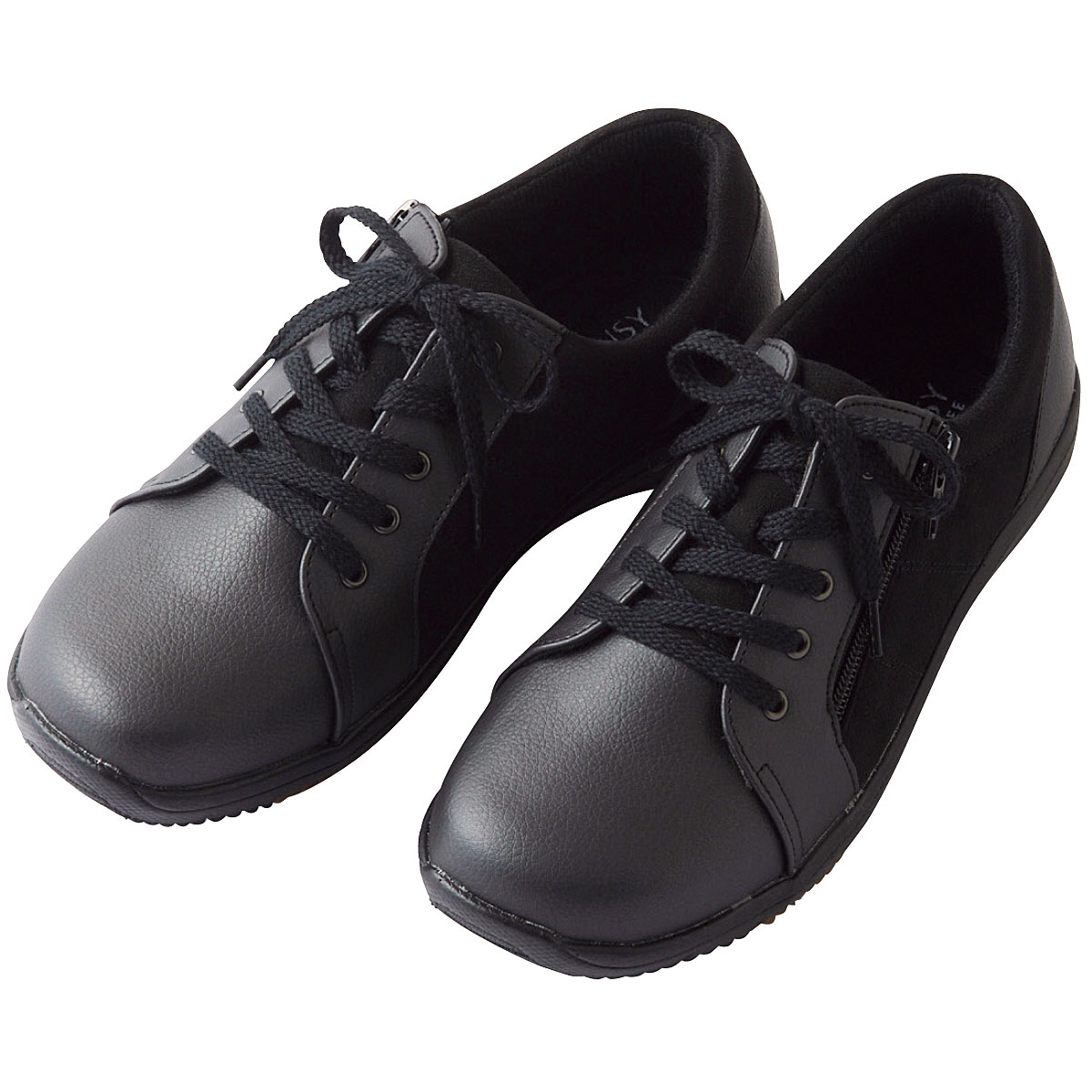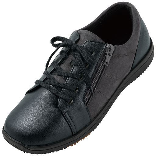 シックなスエード調素材にメタリックカラーのコンビ使いがアクセント。足指ゆったりの4Eながら、軽くて歩きやすい!普段使いはもちろん旅行にもおすすめです。ーデザインー甲外側のファスナーで、靴ひもをほどくことなくスムーズに着脱できてラク!ー素材特徴ーかかとを包み込むようにフィットするU字型アーチクッションが足裏にかかる衝撃を軽減します。靴底の一部にグリップ性のあるゴム素材を使用。【抗菌防臭(中敷)】【はっ水(スエード調素材部分)】