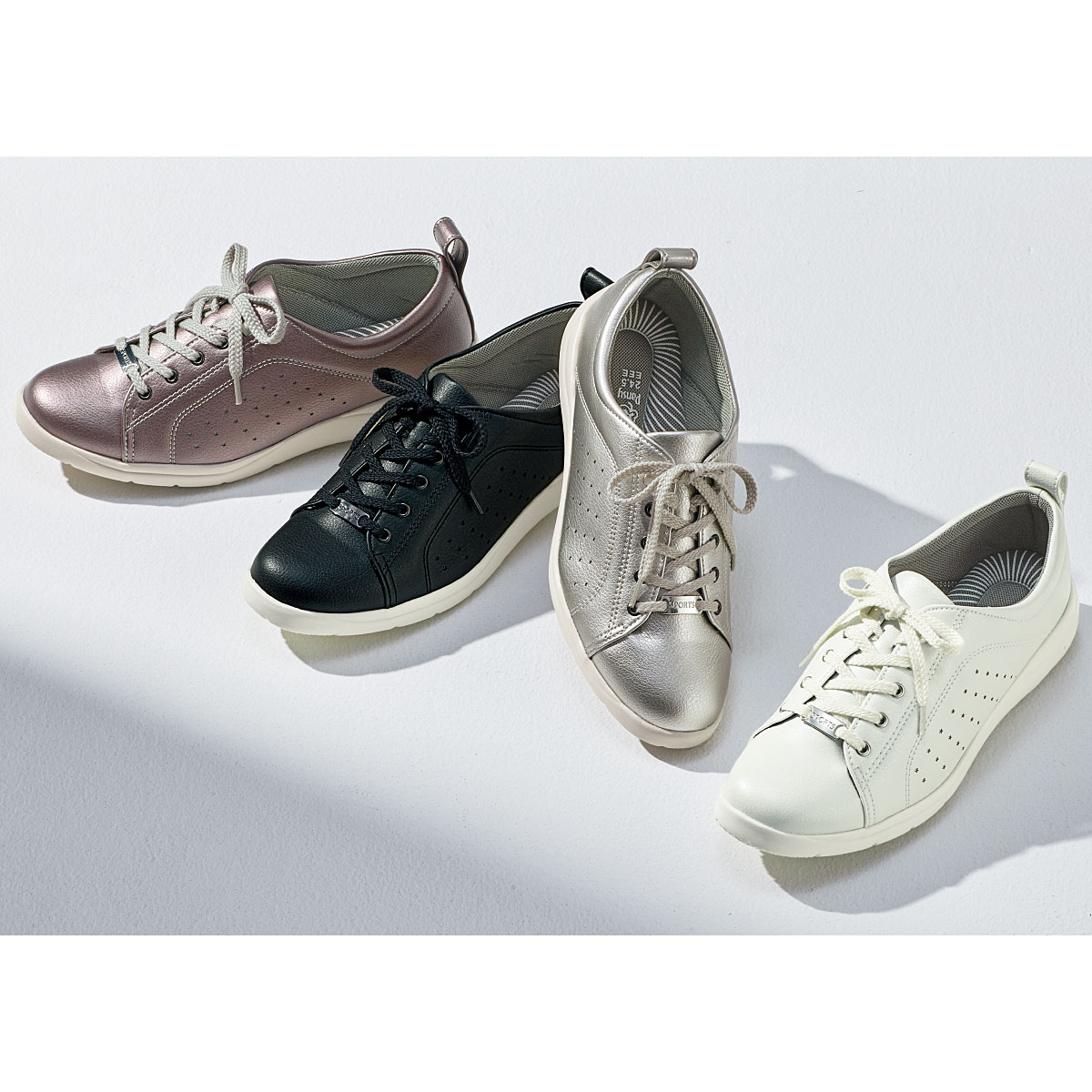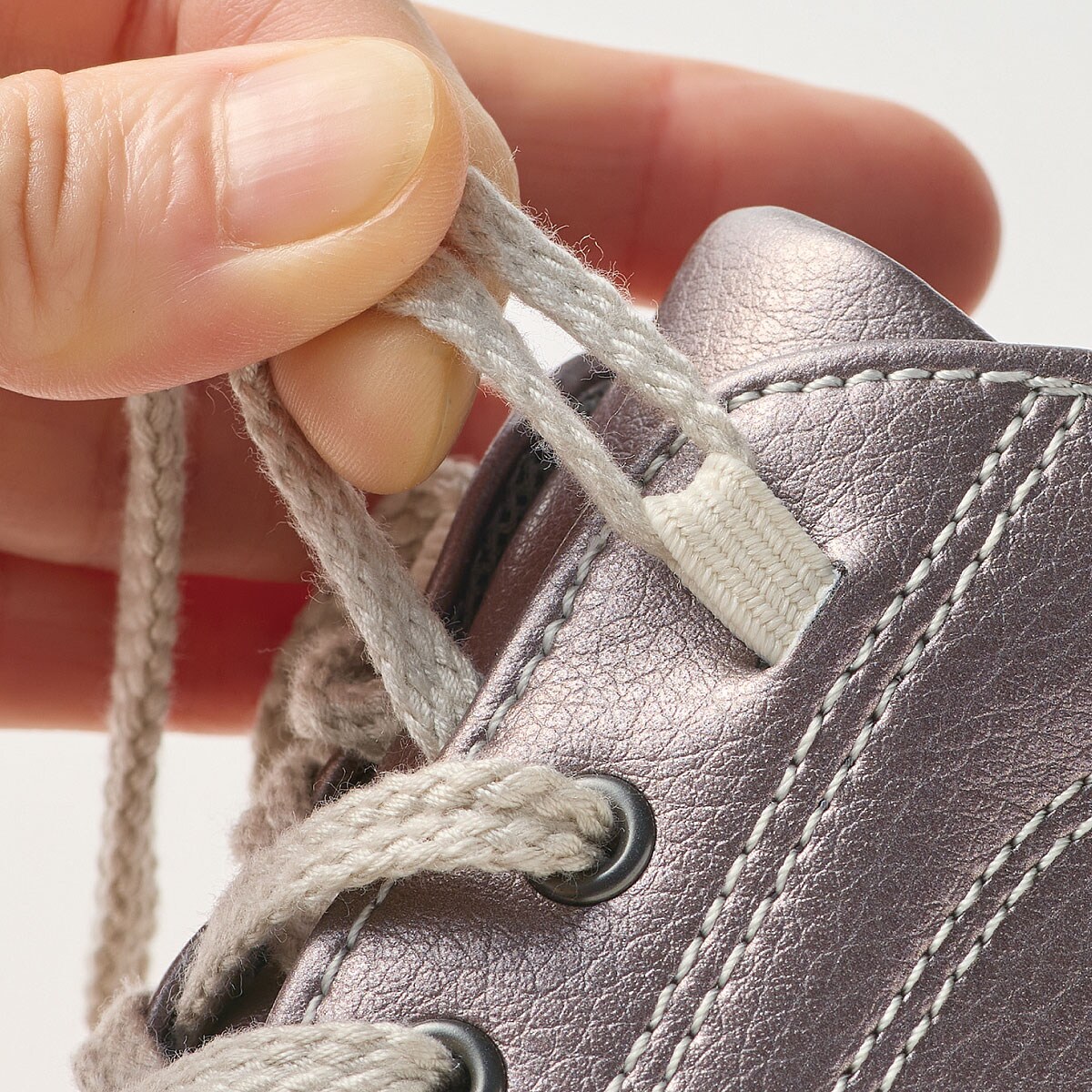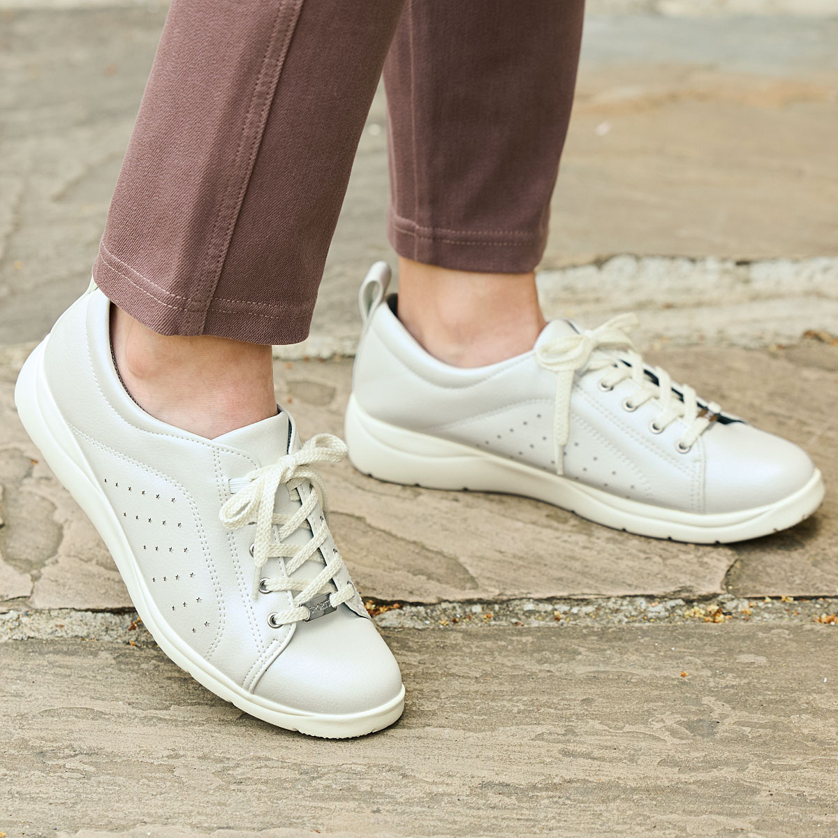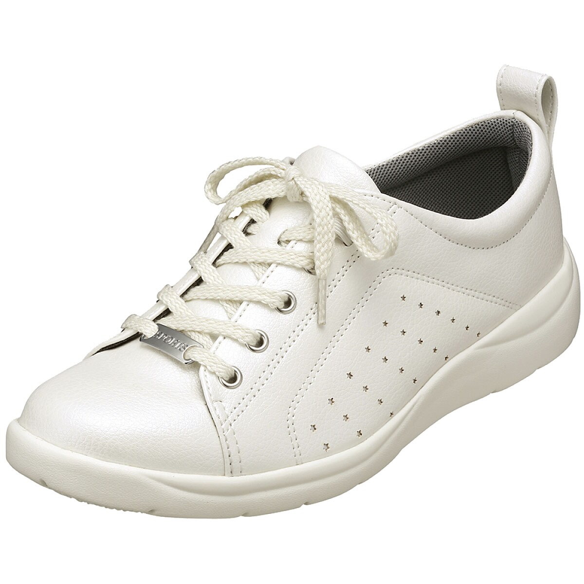ふかふかのインソールが足への負担を軽減、軽さと歩きやすさが嬉しいスニーカー。星形のパンチングがおしゃれなポイントに。ーこだわりPOINTー1.大人かわいいサイドの星型パンチングがアクセントに。2.はき口に近いひも通しにゴム素材を使用して、足入れをサポート!3.中敷のU字型アーチクッションが足裏にフィットし、衝撃を緩和。【軽量約170g(23cm片足)】【抗菌防臭(中敷)】