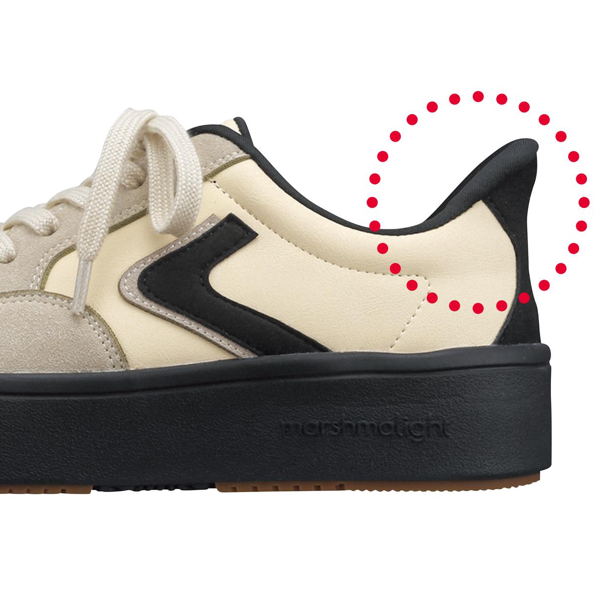 軽量でマシュマロのような柔らかさと弾力性をもつ独自設計のアウトソールで弾むように軽やかな歩き心地を実現。ー素材特性ー優れた弾力性を発揮する軽量ソール「marshmalight®」ーこだわりPOINTー1.スムーズな足入れをサポート…足を滑らせるようにして、足入れしやすいかかと形状です。2.足裏への衝撃を緩和…弾力性のあるカップインソールがかかとを包み込むようにフィットして足裏への衝撃を緩和。3.弾力性のある厚底ソール…マシュマロのような弾力を持つ軽量ソール。