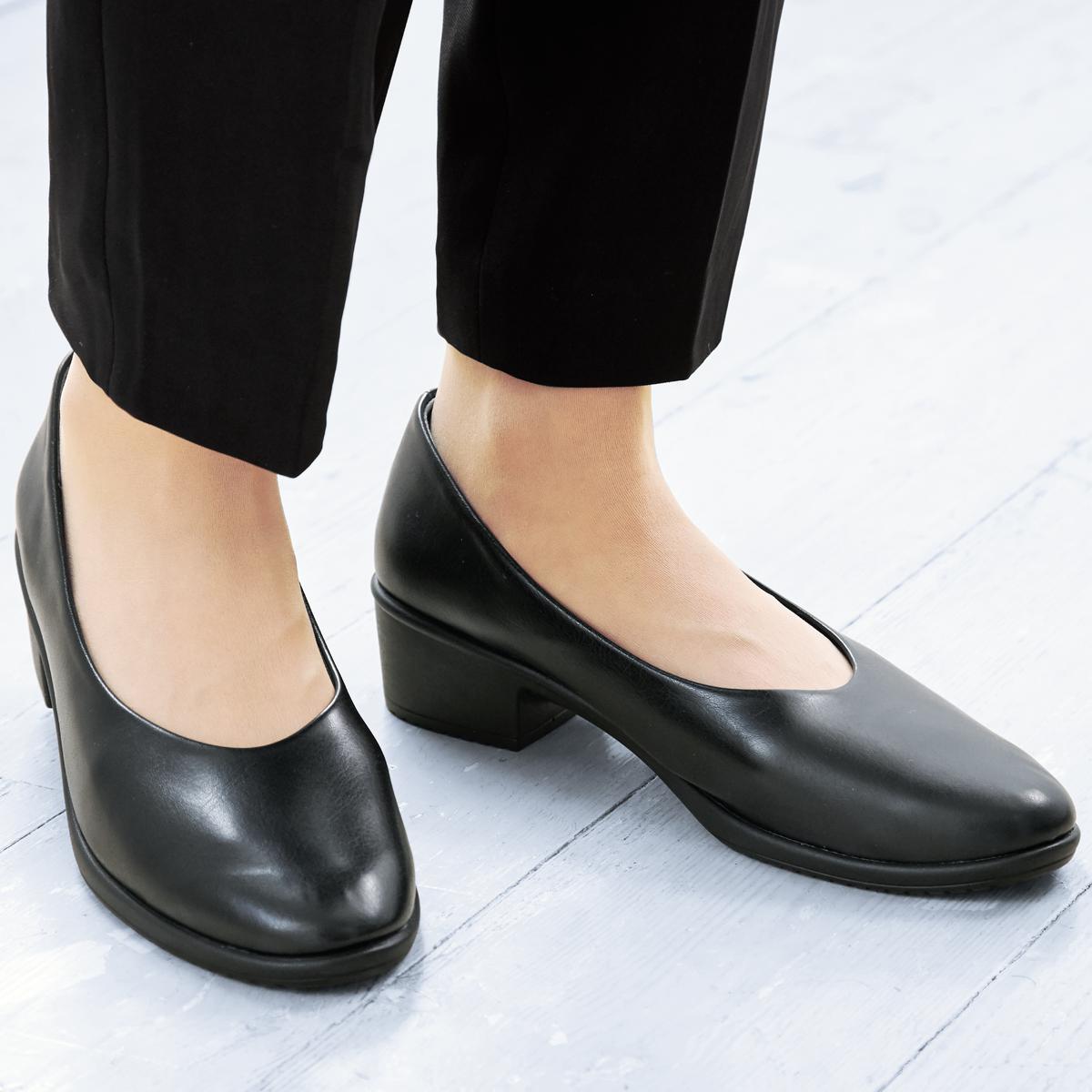 やや高めの約4.5cmながら、安定感のあるヒールで足元をスッキリ見せます。かえりが良く、軽量のソールで長時間はいてもラクです。ーこだわりPOINTー・U字型アーチクッションが、かかとを包み込むようにフィットして足裏への衝撃を緩和します。・甲部分は足の動きにフィットする伸縮性のある素材を使用し、快適歩行をサポート。・ツヤのある合成皮革素材が上品な印象を与えます。