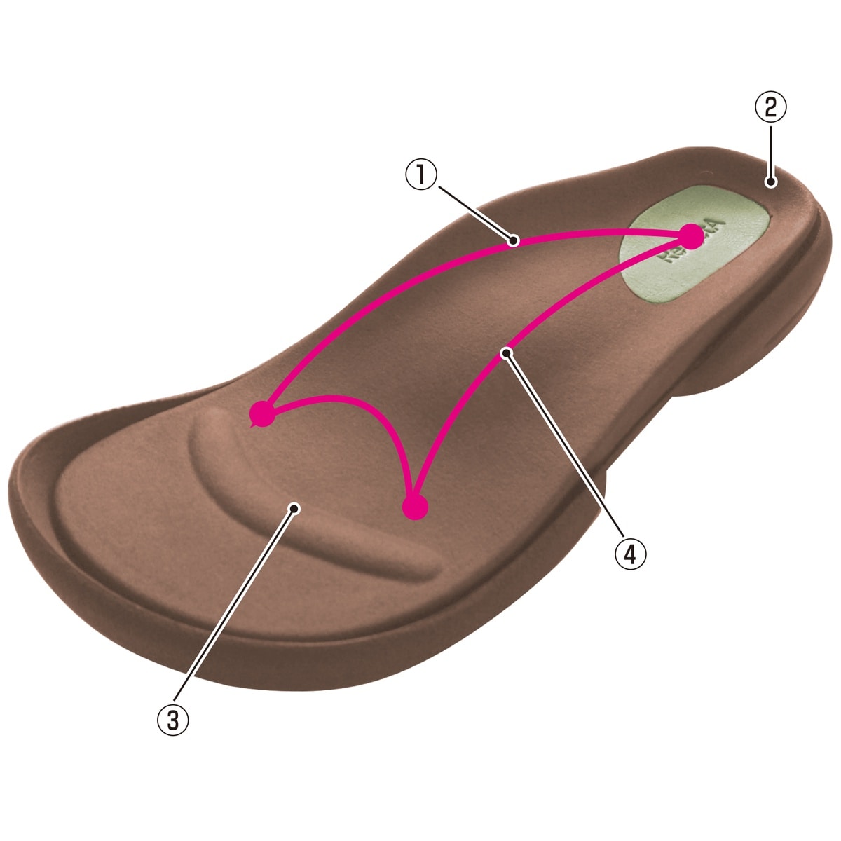 (1)アーチサポート…土踏まずの隙間を埋め、足裏にかかる負担を分散 (2)ヒールカップ…かかとを支える (3)フィンガーバー…インソールと足裏の密着度UP (4)中足骨サポート…足裏の横アーチを支える ※イメージ