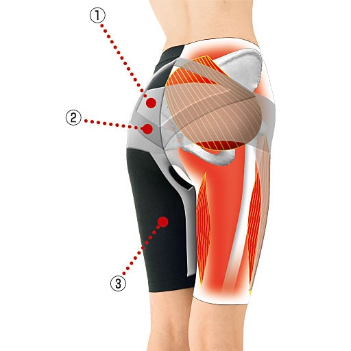 (1)最強圧…基本となる股関節周りを強化 (2)強圧…股関節周りの筋肉をサポート (3)弱圧…足運びをスムーズにする伸縮性に優れたフィット感のある生地 ※イメージ