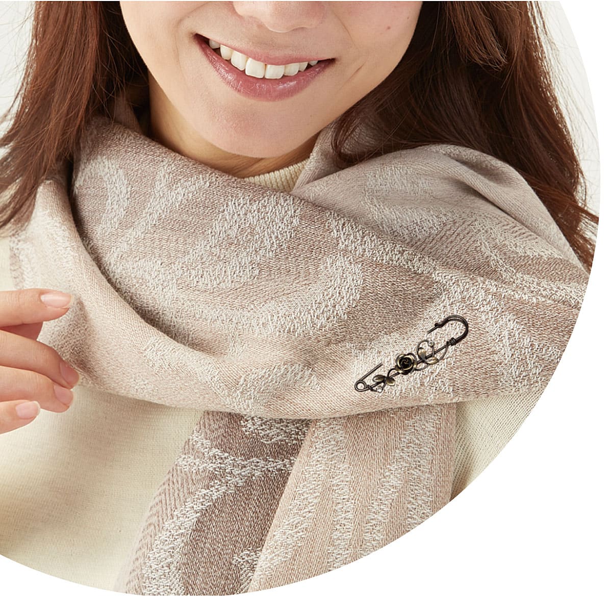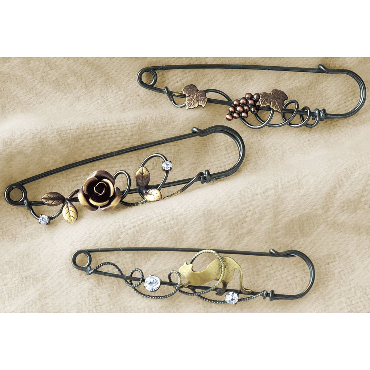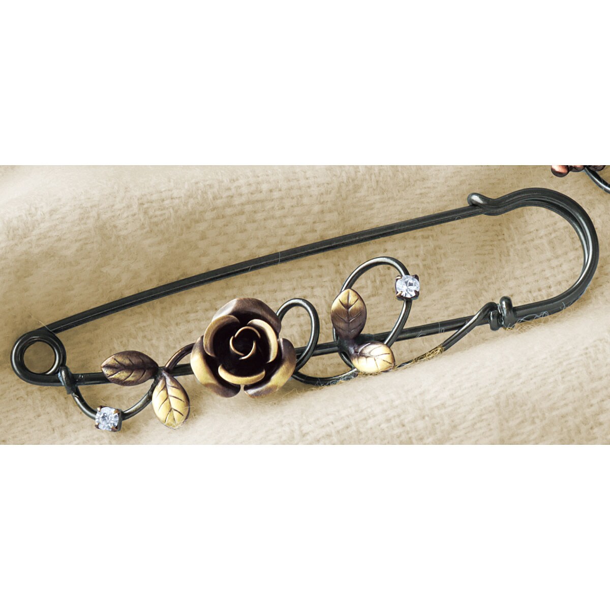 丹念に手作りしたアンティーク風のデザインでマフラーやストールと合わせて装いをグッと華やかに。ーこだわりPOINTー手曲げした真ちゅう線やパーツをひとつひとつ手作業で溶接した、ツヤのある上品な仕上がり。ピンの先も引っかからないよう丁寧に磨いています。