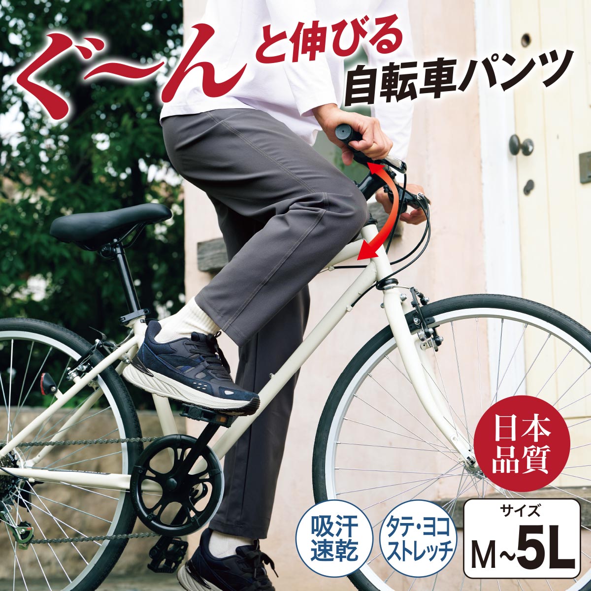 -お買い得ポイント-軽くてよく伸びるアクティブパンツ決定版。ぐ~んと伸びる爽やかなメッシュ素材の自転車パンツです。股下3丈を選べます。-デザイン-内側寄りのステッチと裾幅細いシルエットで足長見え。ストレッチ機能でぐ~んと伸び、足が動かしやすい。ウエストは楽ちん総ゴム。前とじですっぽりはける。-素材特徴-吸汗速乾素材で汗のベタつきが気にならず、心ゆくまで動けます。